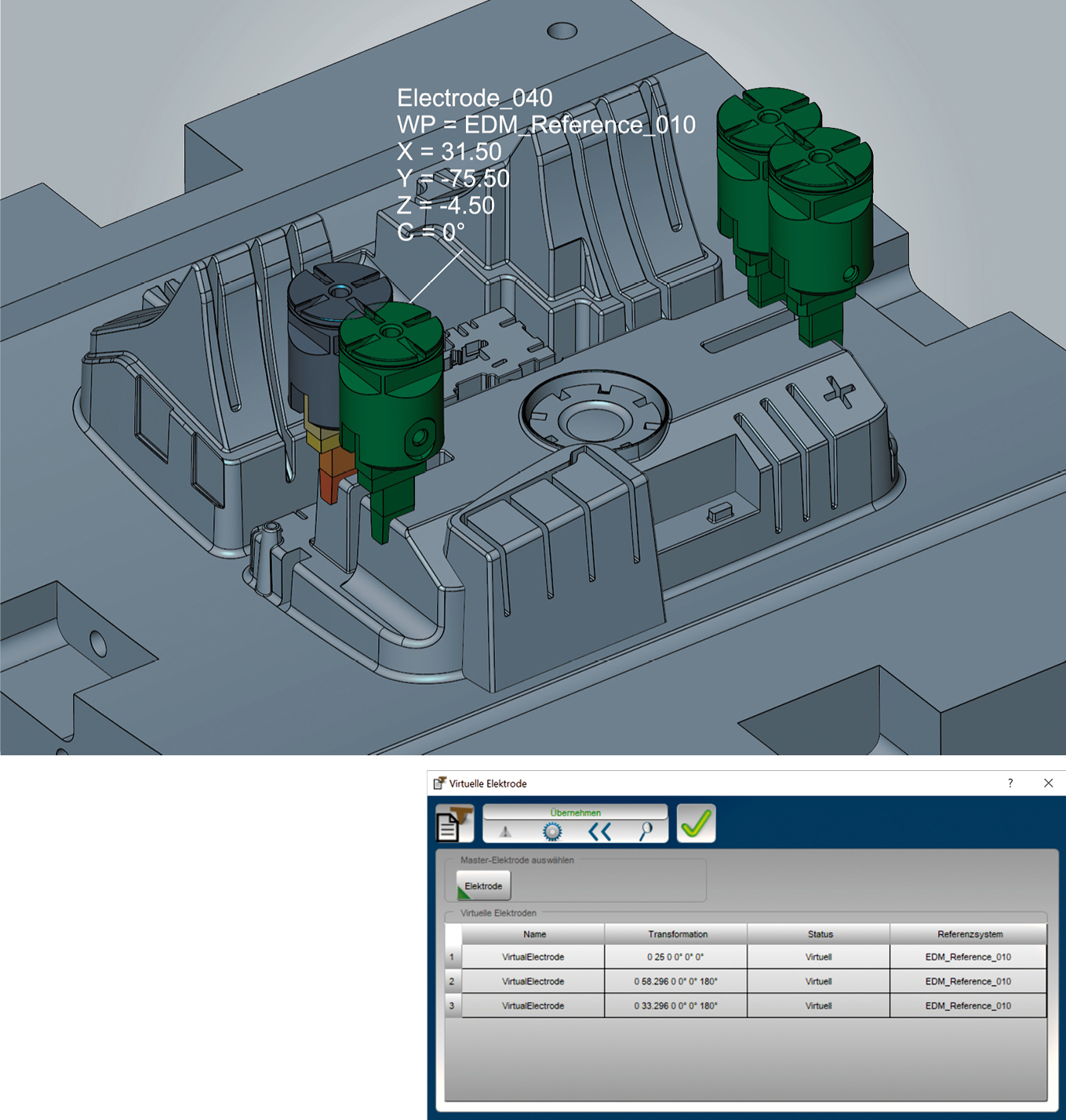 Eine wichtige Neuerung der letzten Version wurde in hyperMILL® 2018.2 noch weiter verfeinert: das Elektrodenmodul, mit dem Senkerodierelektroden automatisch aus zu erodierenden Flächen in der Bauteilgeometrie abgeleitet werden. Mit der Funktion „Virtuelle Elektrode“ lassen sich jetzt Kopien einer bereits erstellten Elektrode an verschiedenen Positionen erzeugen. Diese sind kollisionsgeprüft und können die Technologiewerte der Masterelektrode besitzen oder neue Technologiewerte zugewiesen bekommen. Diese Werte werden beim Elektrodenfräsen entsprechend verarbeitet. Referenzsystem und Erodierposition stehen für jede Kopie im Report zur Verfügung.
