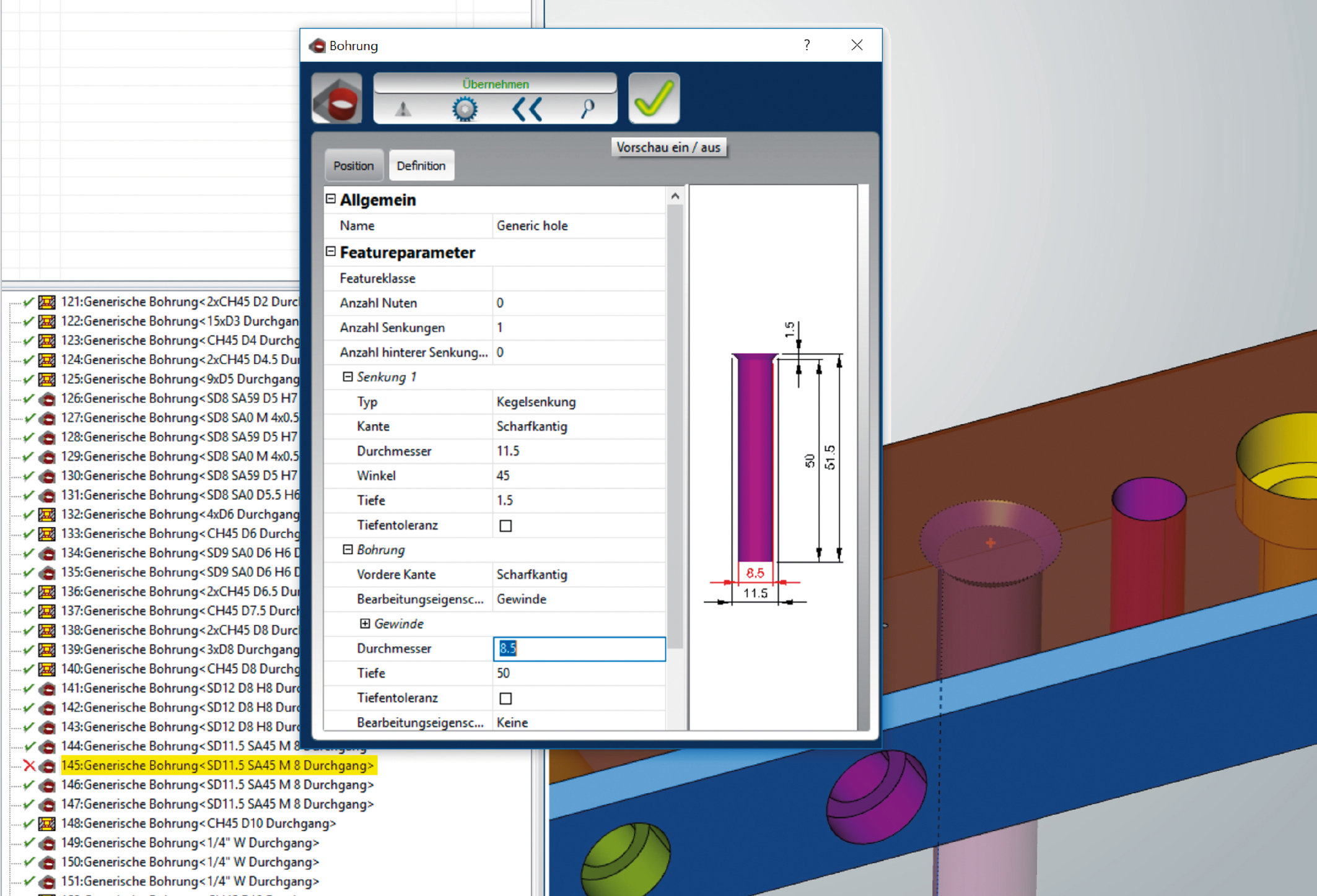 Mit der Bohrfeature-Verknüpfung werden Modelländerungen an den CAD-Features automatisch in hyperMILL® übernommen. Da die Konstruktionsänderungen im CAD assoziativ mit dem CAM verknüpft werden, können Anwender schnell und sicher Korrekturen vornehmen.