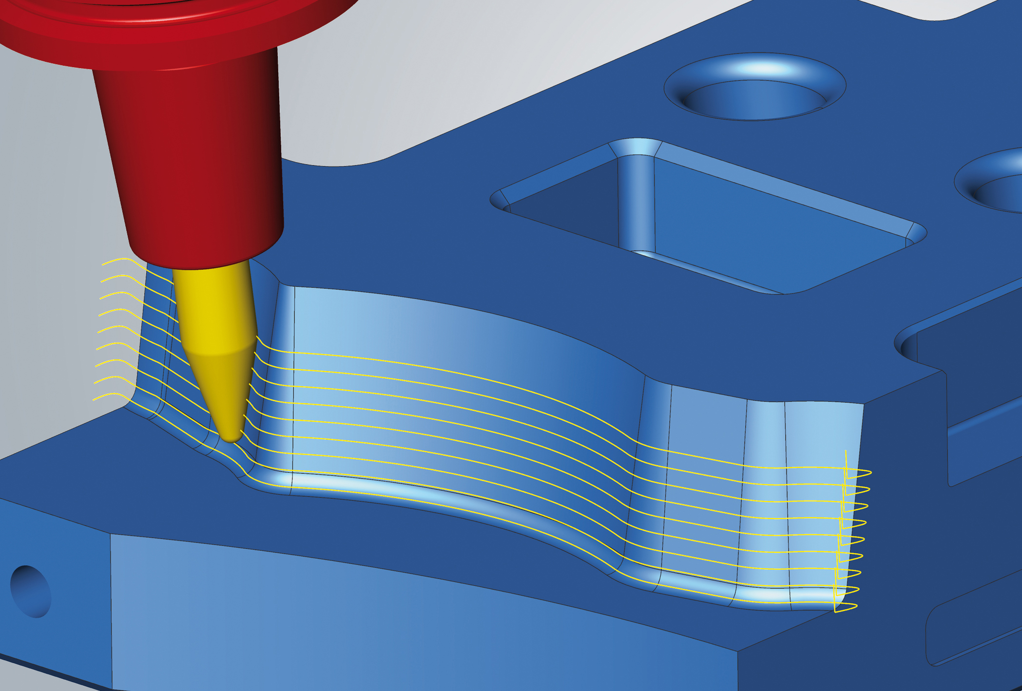 Neu ist auch die Strategie „5-Achs-Schlichten prismatischer Verrundungen“, die die innovativen Strategien für die hocheffiziente Bearbeitung von Ebenen und krümmungsstetigen Flächen ergänzt. Diese Strategie ermöglicht es, Tonnenfräser nach dem Prinzip eines Hochvorschubfräsers mit einer stechenden und ziehenden Bearbeitung einzusetzen. Die optimale Anstellung des Tonnenfräsers wird dabei vollautomatisch berechnet. So lassen sich unter anderem hochwertige Übergänge zwischen verschiedenen Wandbereichen herstellen. Diese Strategie ist eine hervorragende Ergänzung für die Bearbeitung von tiefen Taschen mit Tonnenfräsern.