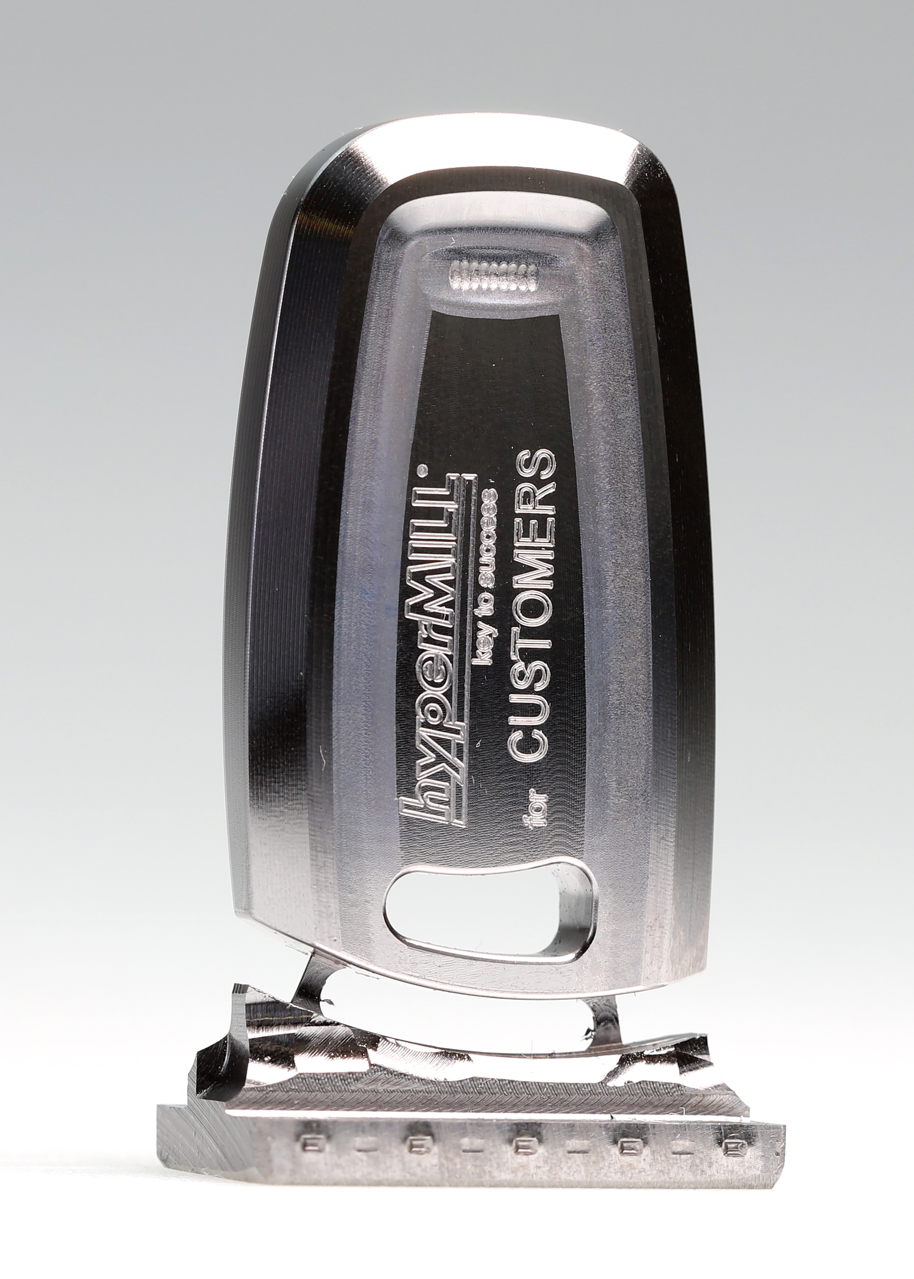 Der frisch gefräste Schlüssel wurde am Ende jeder Präsentation mit Namensgravur unter den Besuchern verlost. Nicht zum Mitnehmen, sondern nur zum Begutachten waren die zahlreichen Demostücke, an denen hyperMILL®-Lösungen für die Aerospace-Industrie, den Werkzeug- und Formenbau oder den Prototypenbau sichtbar gemacht wurden.