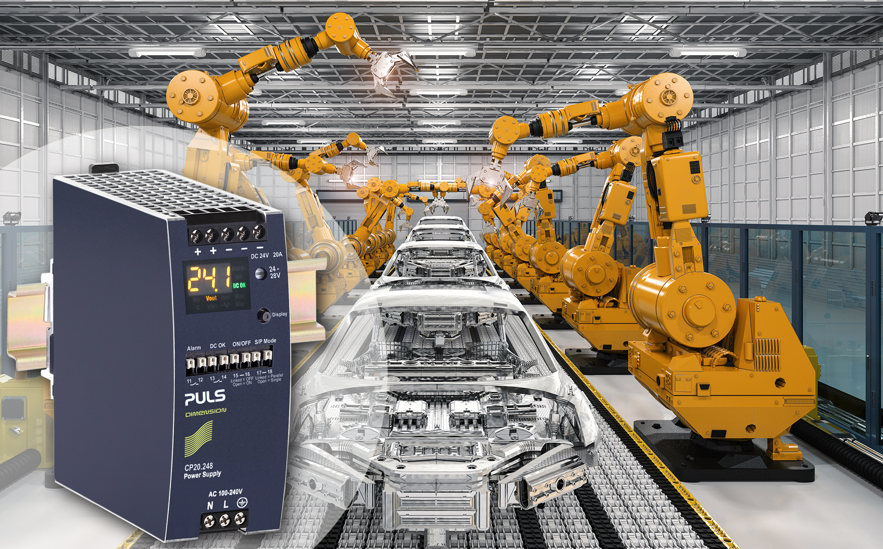 Das Hutschienen-Netzteil CP20.248 ist ideal für den Einsatz in der Automobilfertigung.