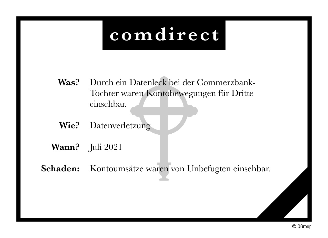 Beim Online-Banking der Commerzbank-Tochter Comdirect kam es zu einem Datenleck. Kunden, die sich ihre Kontoumsätze als CSV-Datei exportieren wollten, wurden teilweise die Kontoauszüge anderer Kunden angezeigt. Die Kontoübersicht wurde von Comdirekt daraufhin für einige Stunden abgeschaltet. Betroffene Kunden und die zuständige Datenschutzbehörde wurden informiert.
