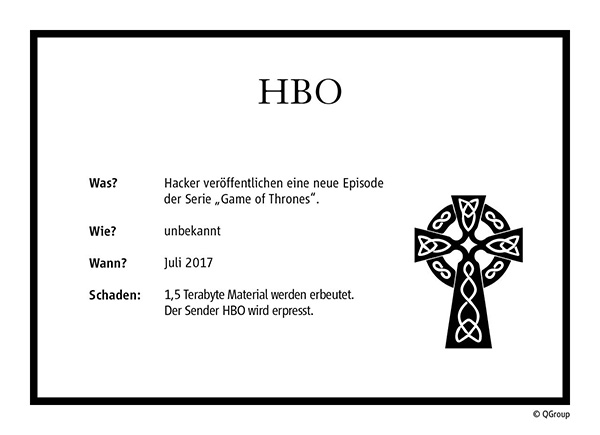 Der amerikanische Pay-TV-Sender Home Box Office (HBO) bestätigt, Opfer einer Cyberattacke geworden zu sein. Die Hacker erbeuten von internen Servern des Senders 1,5 Terabyte Material und stellen eine Lösegeldforderung in Millionenhöhe. Kurz darauf stellt die Erpressergruppe, die sich „Mr. Smith“ nennt, vorab die 4. Folge der 7. Staffel von „Game of Thrones“ online. Neben der Veröffentlichung weiterer Folgen und Drehbücher der Erfolgsserie sowie anderer Serien drohen sie mit der Veröffentlichung von Informationen über Verträge, personelle Ressourcen, Geschäfts- und Marketingstrategien, IT- Infrastrukturen, Film- und Serienproduktionen, internen Briefen, vertraulichen E-Mails und Beweisen für Steuerflucht. Teile des Materials schicken die Cyberkriminellen an die Presse.