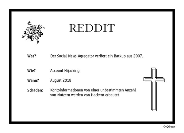 Der US-amerikanische Social-News-Aggregator Reddit, eine Website, auf der registrierte Benutzer Inhalte einstellen bzw. anbieten können, wurde zum Ziel von Cyberkriminellen. Hackern ist es gelungen, die Zwei-Faktor-Authentifizierung zu besiegen und die Accounts zweier Reddit Mitarbeiter zu kapern. Mit den erbeuteten Zugriffsrechten konnten die Angreifer ein Backup von 2007, welches die Daten zu allen bis dahin registrierten Nutzer enthält, stehlen.