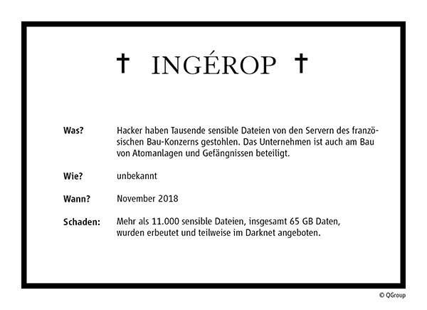 Bei einem Angriff auf das französisches Bauunternehmen Ingérop konnten Hacker zahlreiche Dokumente zu kritischer Infrastruktur wie Atomkraftwerken, Gefängnissen und Straßenbahnnetzen erbeuten. Der Konzern, der seinen Hauptsitz in der Nähe von Paris hat und weltweit an großen Bauprojekten beteiligt ist, bestätigte den Angriff, der wohl bereits im Juni erfolgte. Mehr als 11.000 sensible Dateien, insgesamt 65 GB Daten, wurden erbeutet und teilweise im Darknet angeboten. Die Ermittlungen führten zunächst nach Deutschland, wo ein Server steht, der für den Angriff benutzt worden ist. Die Spur endete aber in Rostock.