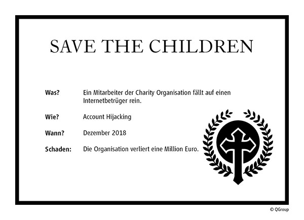 Ein Mitarbeiter der Charity Organisation Save the Children erhält eine E-Mail mit der Anweisung, eine Million Euro an ein angegebenes Konto zu überweisen. Im Anhang der EMail befinden sich angeblich offizielle Dokumente, die die Überweisung genehmigen und bestätigen. Für den Mitarbeiter scheint alles ganz normal. Es ist nicht die erste Überweisung mit einem solch hohen Betrag, die von ihm durchgeführt werden soll. Später fragt sich die Führungsetage, warum der Organisation eine Million Euro fehlen und warum in Pakistan kein Geld für eine Solaranlage angekommen ist. Schnell wird klar, dass die Organisation Opfer eines Internetbetrügers geworden ist. Der Mitarbeiter hatte eine Million Euro auf ein privates Konto in Japan überwiesen. Der Betrug erfolgte bereits im Mai 2017, die Details wurden allerdings erst viel später veröffentlicht.