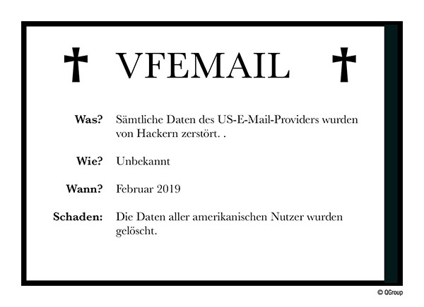 Unbekannte Hacker haben sämtliche Daten des US-E-Mail-Providers VFEmail zerstört, die sich auf amerikanischen Festplatten befanden. Sogar die Backup-Festplatten wurden durch den Angriff unbrauchbar gemacht. Damit haben alle amerikanischen Kunden ihre Daten verloren. Lediglich die in den Niederlanden stationierten Festplatten blieben von dem Angriff verschont.