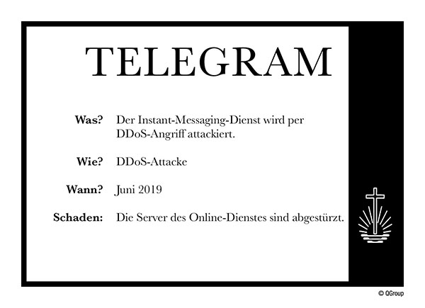 Der Instant-Messaging-Dienst Telegramwurde während der Hongkong Proteste von chinesischen Hackern per DDoS-Attacke angegriffen. In der Folge stürzten die Server des Online-Dienstes ab. Experten sprechen von einem koordinierten Angriff der chinesischen Regierung, um die Kommunikation der Protestler zu stören.