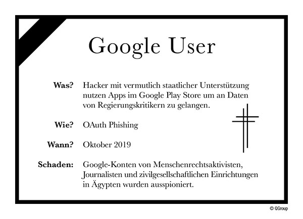 Eine Hackergruppe nutzte Apps im Google Play Store, um an Daten von Regierungskritikern, darunter Menschenrechtsaktivisten, Journalisten und zivilgesellschaftliche Institutionen in Ägypten, zu gelangen. Es wird vermutet, dass die Hacker von der ägyptischen Regierung unterstützt wurden.