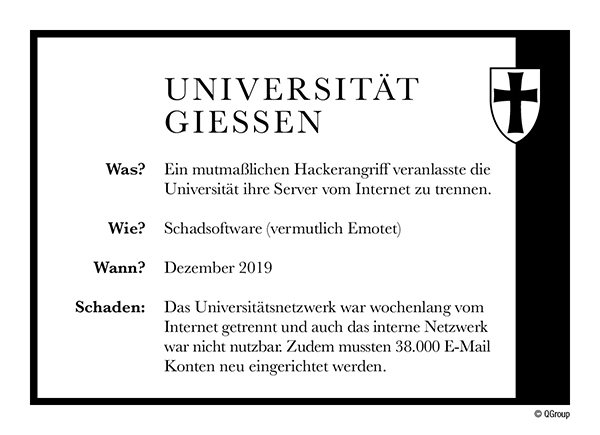 Ein mutmaßlicher Hackerangriff mit der Ransomware Ryuk hat dazu geführt, dass die Uni Gießen sämtliche Passwörter für rund 38.000 E-Mail-Konten von Studenten und Mitarbeitern zurückgesetzt hat. Bereits seit dem 9. Dezember 2019 war die Uni Gießen offline und vom Internet getrennt. Auch das Interne Netzwerk war nicht nutzbar. Die neuen Passwörter müssen wegen den Vorgaben des Deutschen Forschungsnetz-Vereins (DFN) persönlich abgeholt werden.