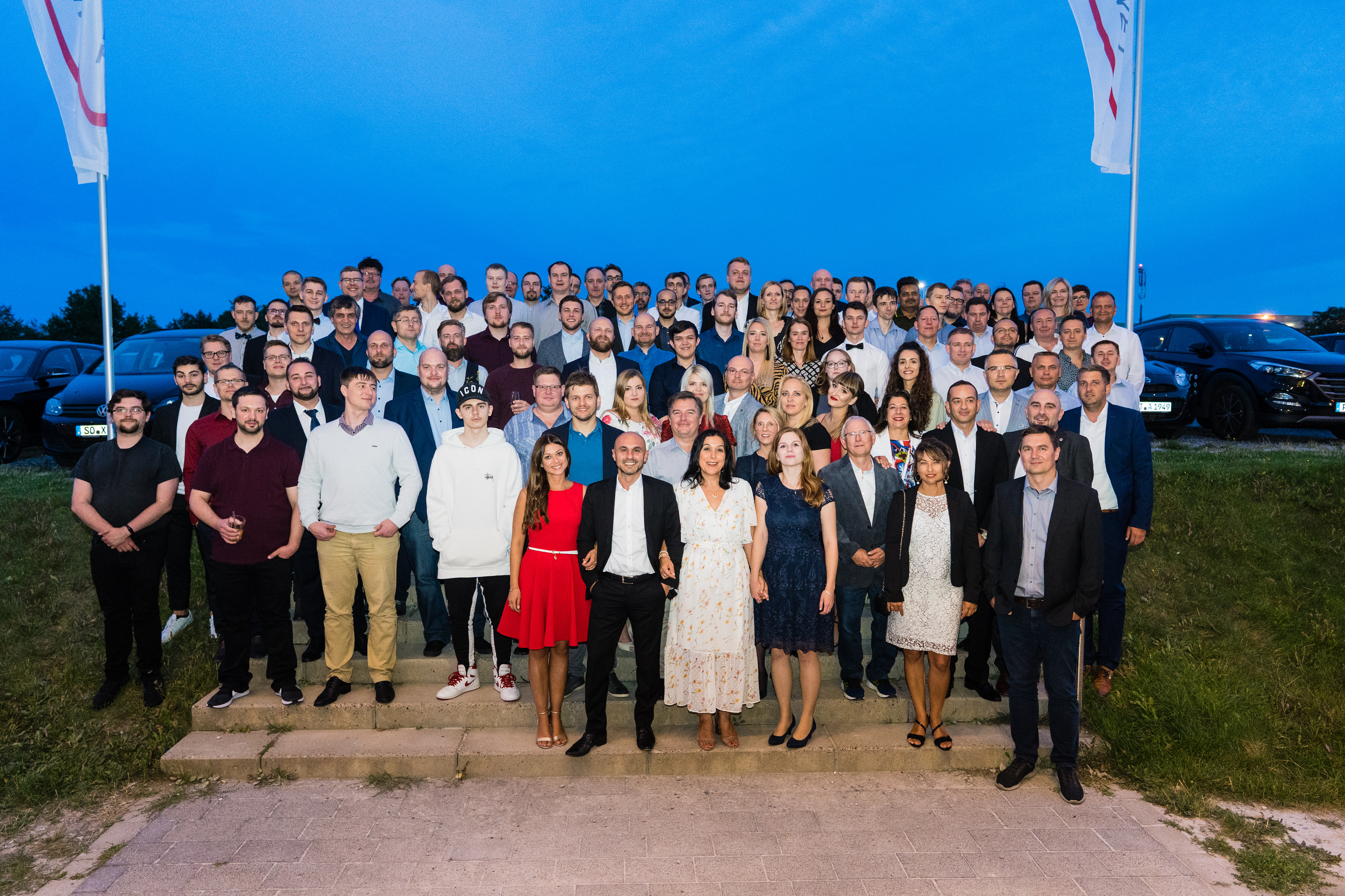 IHK-Geschäftsführer Swen Binner, Raynet-Geschäftsführer Ragip Aydin, IHK-Hauptgeschäftsführer Thomas Niehoff, Raynet-Ausbilderin Anja Wöstenkühler und Raynet-Marketingleiterin Isabella Borth mit einem Großteil der Auszubildenden des Paderborner IT-Unternehmens (v. r.) beim Fototermin anlässlich der Best-Practise-Tour. Foto: IHK