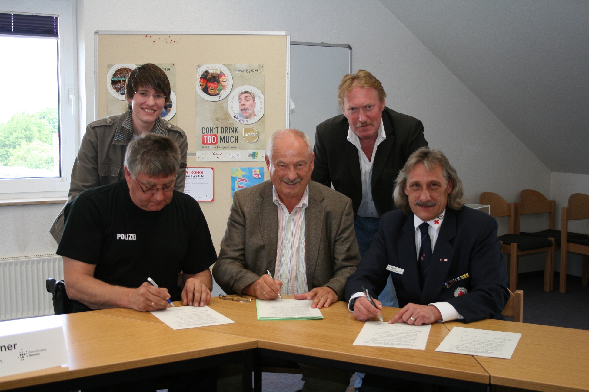 Bildunterschrift: In einer bislang beispiellosen Aktion gehen Region Hannover, die Polizei und das Deutsche Rote Kreuz gemeinsam gegen Alkoholmissbrauch von Jugendlichen auf dem Stadtfest Ronnenberg vor. Hier unterzeichnen Bernd Kmiec-Schulz von der Polizei Ronnenberg, Holger Schöne, Leiter des Fachbereichs Öffentliche Sicherheit der Region Hannover, und Regionsbereitschaftsleiter Michael Meyen vom Regionsverband Hannover des Deutschen Roten Kreuzes eine gemeinsame Vereinbarung (vordere Reihe von links nach rechts). Mit dabei: Melanie Wottke (hinten links) vom gesetzlichen Jugendschutz der Region und Hans-Joachim Elsner (hinten rechts), zuständiger Beauftragter für Jugendsachen der Polizeiinspektion Garbsen.