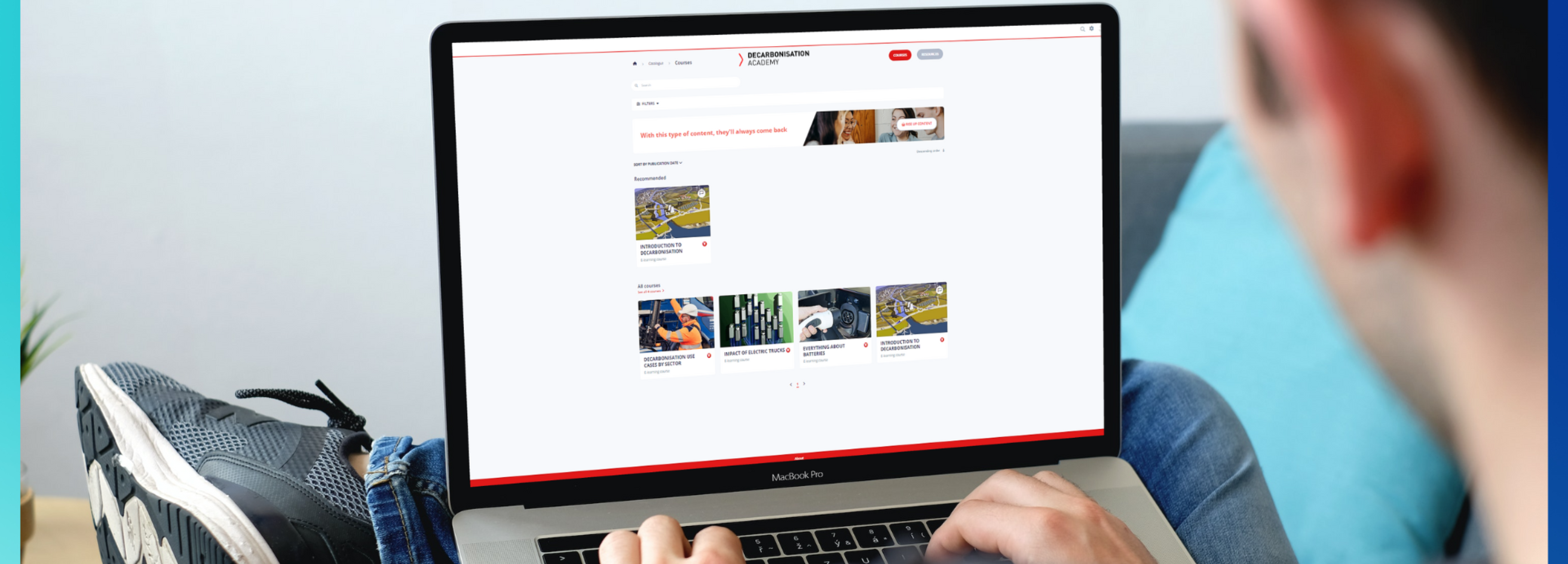 Die Decarbonisation Academy bietet Zugang zu einem Fortbildungskatalog mit Lehrvideos, Expertenmeinungen innerhalb und außerhalb des Unternehmens sowie Erfahrungsberichten von Spediteuren und Karosseriebauern. Jeder Kurs, der aus mehreren Modulen besteht, dauert weniger als 30 Minuten. Vier Kurse sind bereits online: