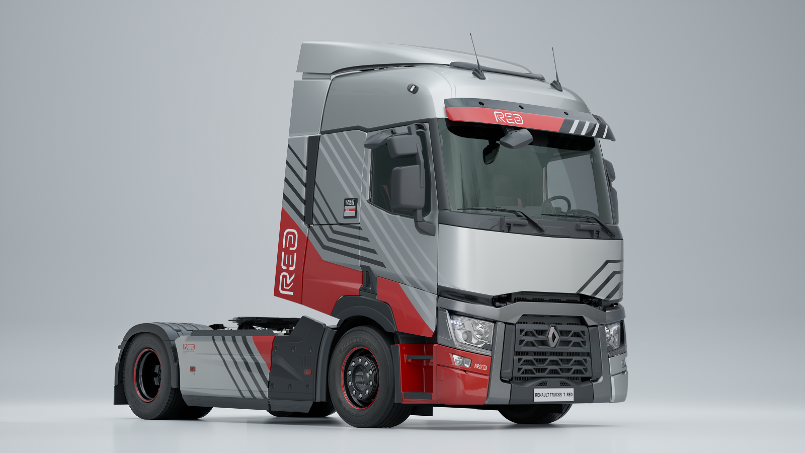 Der Renault Trucks T Red zeichnet sich durch eine, von den eigenen Designteams speziell konzipierte Premium-Ausstattung aus. Die Karosserie weist abgestufte Grautöne sowie den für Renault Trucks typischen roten Farbton auf. Die Designerinnen und Designer nutzten ein asymmetrisches Design und brachten an den Fahrzeugseiten dynamische, grafische Linien an, die das neue Logo von Renault Trucks symbolisieren.