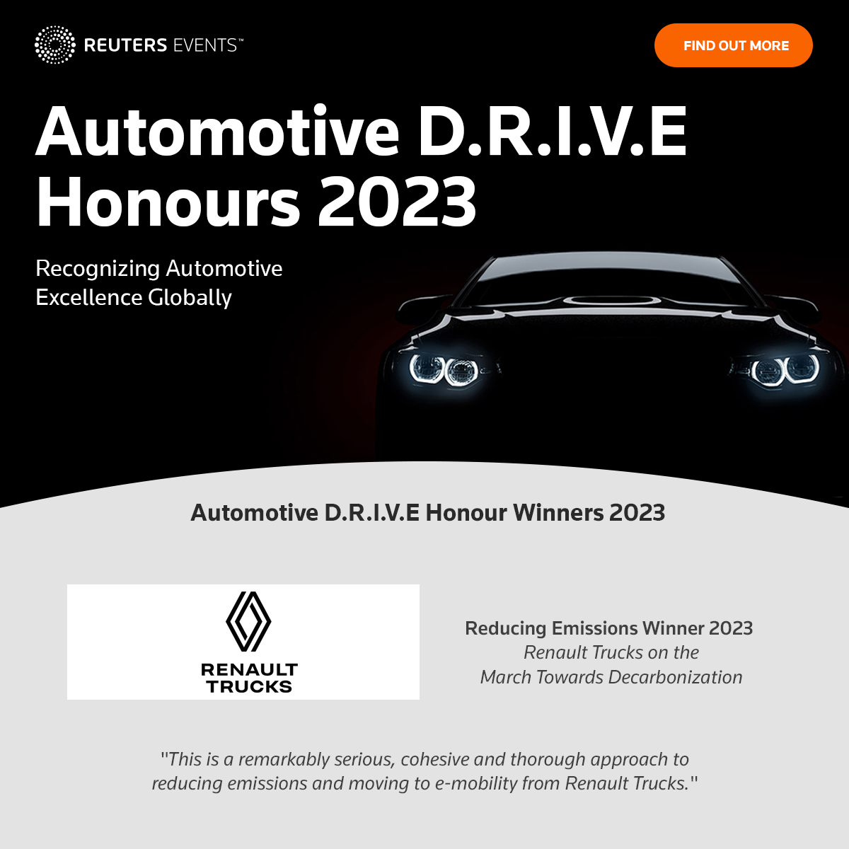 (pressebox) (Ismaning, 19.10.2023) Renault Trucks Deutschland hat den internationalen Award Reuters Automotive D.R.I.V.E. Honours in der Kategorie „Reducing Emissions“ gewonnen. Reuters Events verkündete die Sieger am 19. Oktober 2023 unter dem Motto „Recognize Automotive Excellence Globally“.