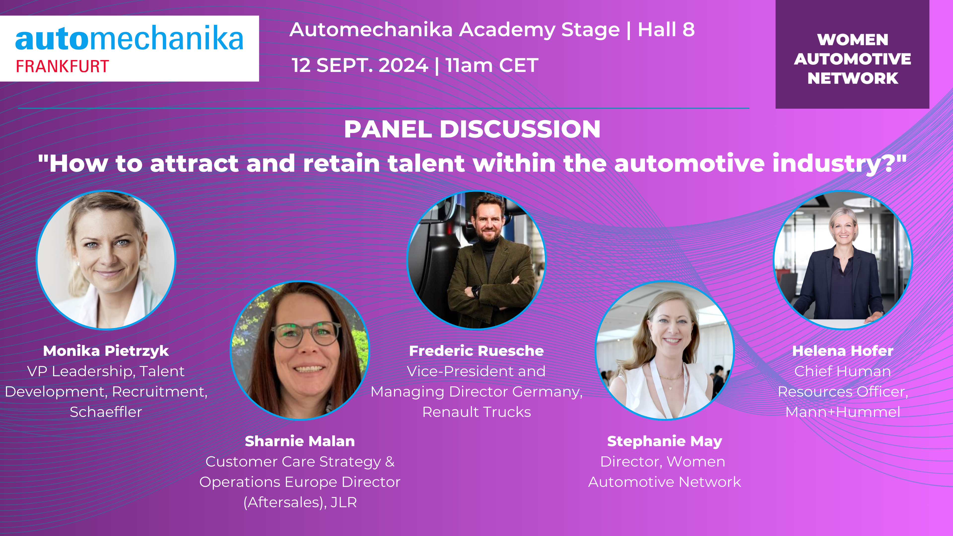 Unter dem Titel „How to attract and retain talent within the automotive industry?“ beleuchtet die Podiumsdiskussion zentrale Fragestellungen rund um die Gewinnung und Bindung von Talenten in der Automobilbranche. Neben Frederic Ruesche werden Monika Pietrzyk, Vice President Leadership, Talent Development, Recruitment und Schaeffler Academy Region Europe bei Schaeffler, Sharnie Malan, Customer Care Strategy & Operations Europe Director (Aftersales) bei JLR, Helena Hofer, Chief Human Resources Officer bei Mann+Hummel sowie Stephanie May, Director des Women Automotive Network, als Sprechende teilnehmen.