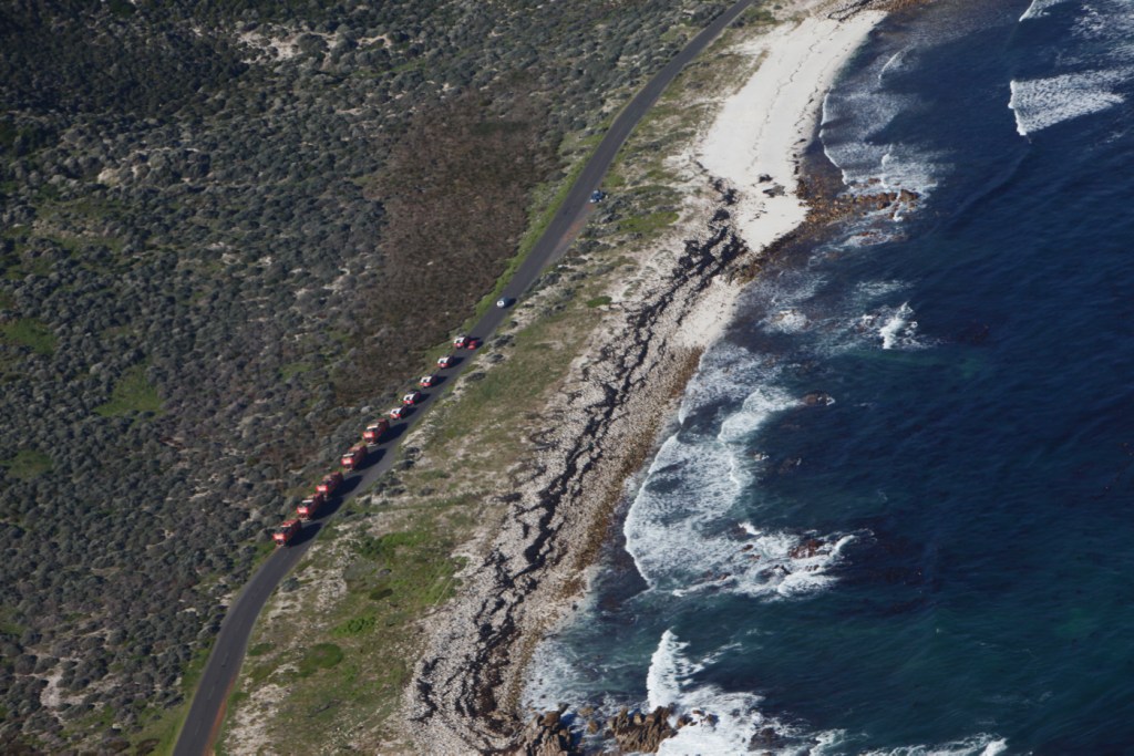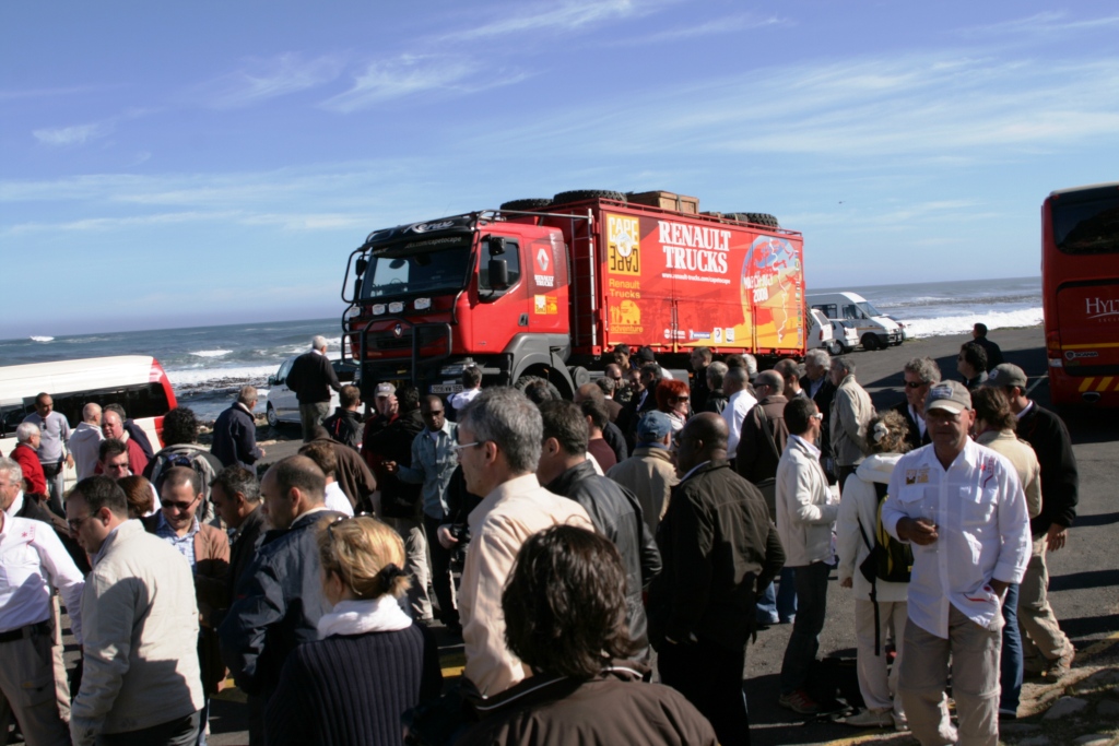 Nach einer letzten Kurve halten die Renault Kerax und Renault Sherpa der Cape-to-Cape- Expedition am Ende der Straße, die bis an den Ozean heranführt. Die Navigationssysteme der Fahrzeuge zeigen die Kapkoordinaten 18° 28' 26'' Ost und 34° 21' 25''. Weiter südlich geht es nicht mehr, sie sind am Ziel angelangt: dem Kap der Guten Hoffnung, dem südlichsten Punkt des afrikanischen Kontinents. Trotz des begleitenden Hupkonzertes könnte der Moment nicht feierlicher sein. Stefano Chmielewski, der Generaldirektor von Renault Trucks, empfängt die Tourteilnehmer persönlich an der Bucht am Kap der Guten Hoffnung. In seiner Ansprache zeigt er sich sichtlich mit dem Ende der Expedition zufrieden. Neben der Qualität und Robustheit der Fahrzeuge hebt der Präsident von Renault Trucks noch einmal besonders den völkerverbindenden Gedanken der Reise hervor.