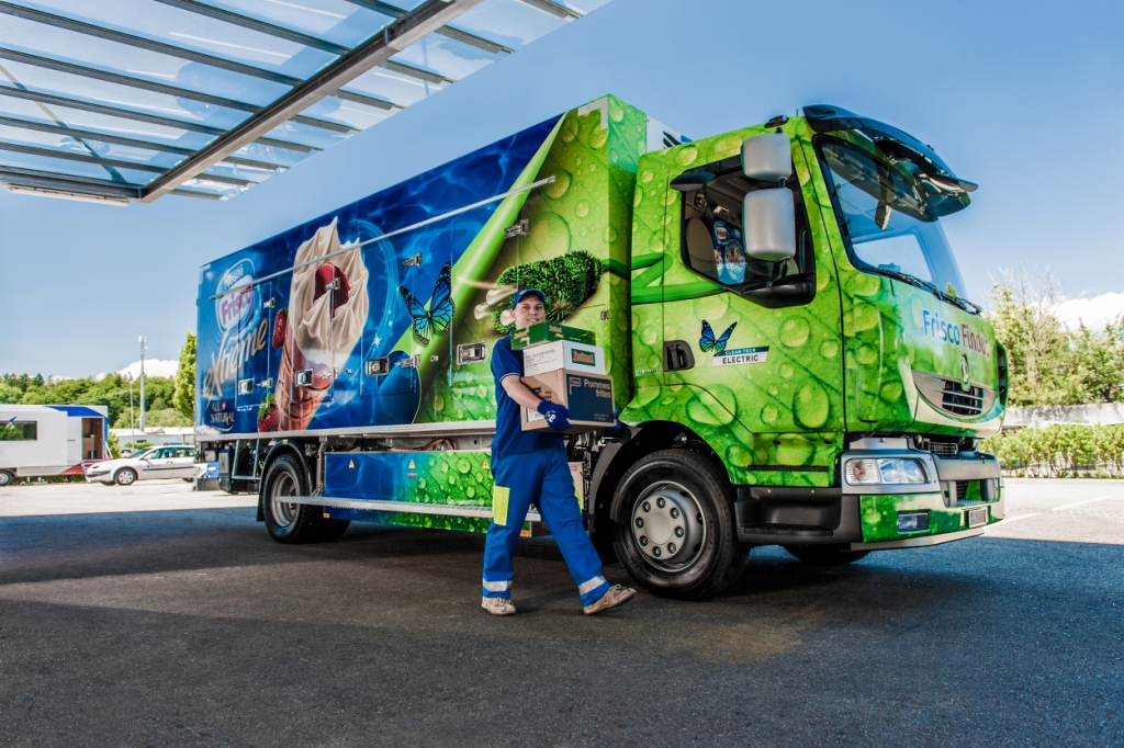 Die beiden elektrischen Renault Midlum 13-Tonner, die für den städtischen Bereich besonders geeignet sind, verfügen über ein Kühlaggregat, das ebenfalls mit Strom betrieben wird. Im Einsatz erzeugen sie somit weder Emissionen noch CO2. Zudem sind sie nahezu geräuschlos. Ihr elektrischer Motor entwickelt eine Leistung von 103 kW. Die Fahrzeuge können eine Höchstgeschwindigkeit von 90 km/h erreichen und verfügen beim Bremsen über ein System zur Energierückgewinnung. Die beiden Lithium-Ionen-Batterie-Pakete mit einer Gesamtkapazität von 170 kWh ermöglichen eine rund 140 Kilometer lange unabhängige Fahrt. Die Aufladezeit beträgt an einer Standard-Steckdose acht Stunden.