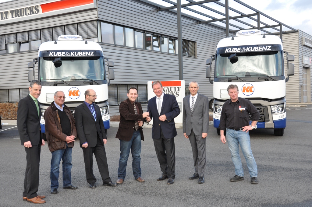 Das 1930 gegründete Traditionsunternehmen Kube&Kubenz ist seit jeher auf den Transport von flüssigen, gasförmigen und rieselfähigen Gefahrgütern und harmlosen Chemikalien, die in Tankzügen und Containern befördert werden, spezialisiert. Über ein Netz von drei deutschen und sechs ausländischen Niederlassungen übernimmt das in Hamburg ansässige Spezialunternehmen umfangreiche Logistikdienstleistungen für führende europäische Unternehmen der petrochemischen Industrie. Die drei neuen Renault Trucks T werden vorrangig in Frankreich für Kube&Kubenz unterwegs sein. Unternehmensinhaber Dr. Michael Kubenz persönlich nahm die Schlüssel für die drei Neuzugänge vom Renault Trucks-Vertriebsteam in Frechen entgegen. In diesem Zusammenhang lobte er insbesondere den Komfort und die Sicherheitsausstattung der neuen Renault Trucks T 460-Sattelzugmaschinen.