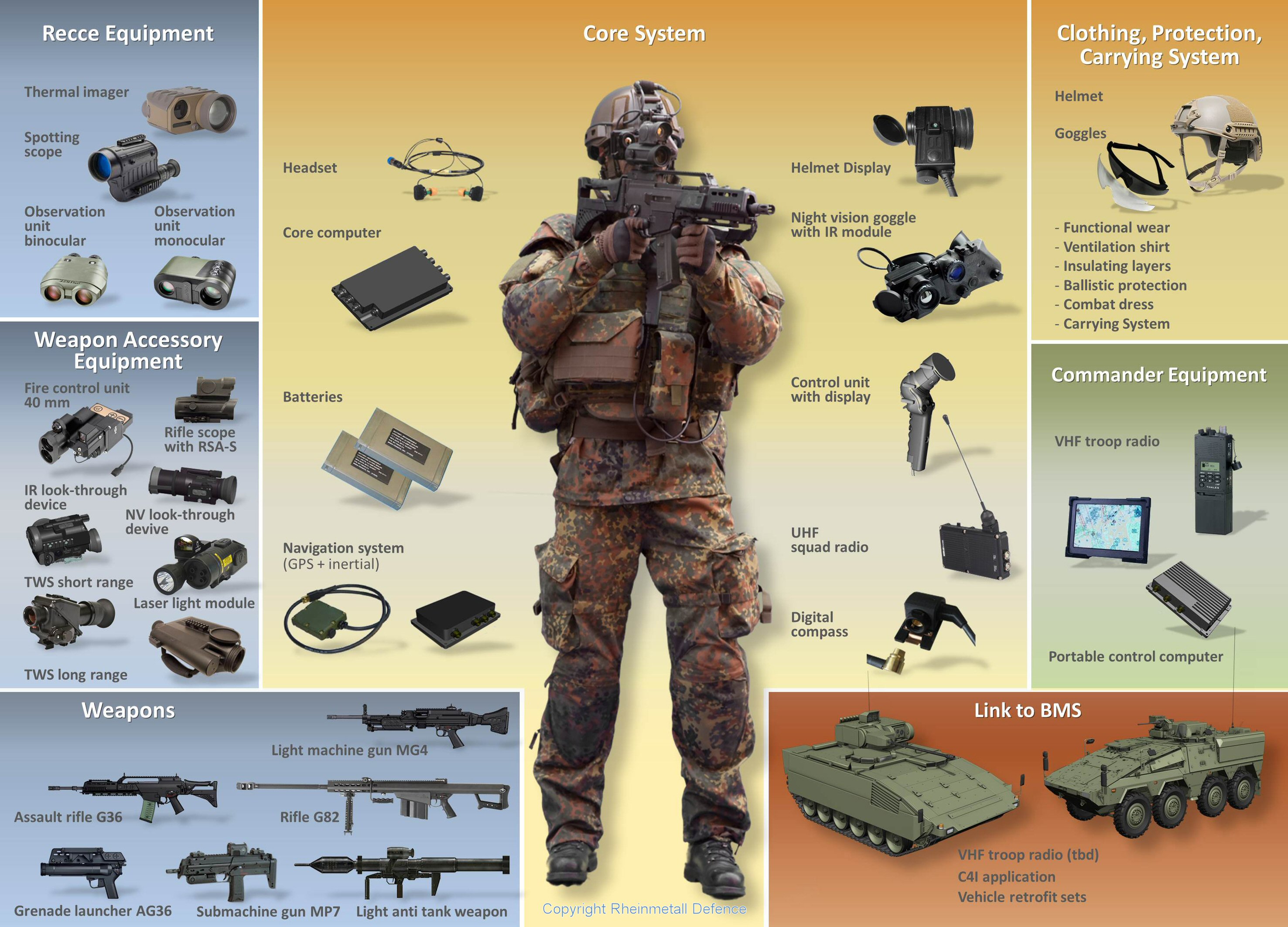 Equally impressive are the system's ergonomic features, especially with regard to weight reduction, miniaturization and improved integration of individual components. The modular battle dress uniform, body armour and harness system provide