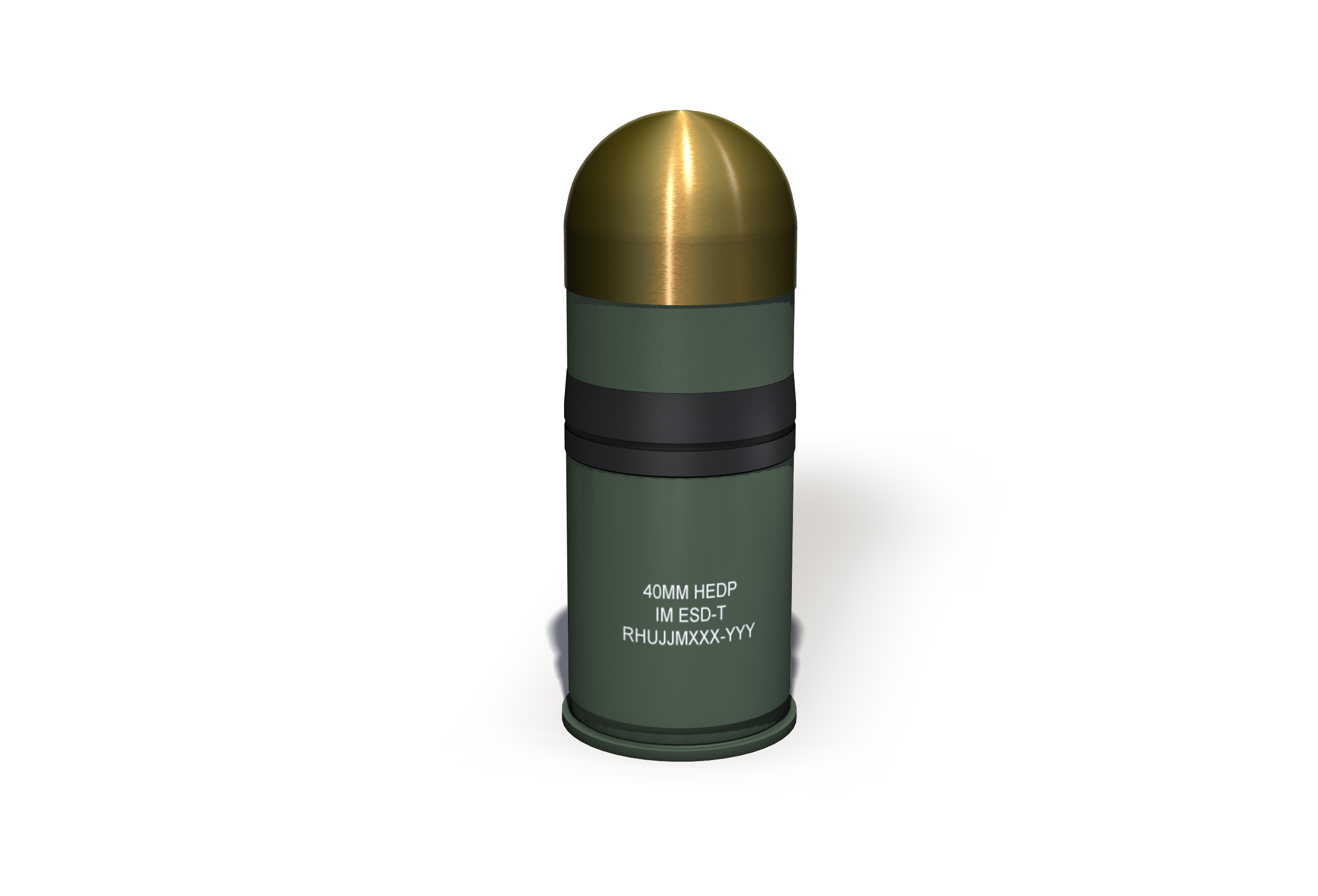 Designed for the use in automatic grenade launchers like MK19, MK47 and Heckler & Koch GMG, the highly accurate enhanced performance 40mm x 53 High Velocity High Explosive Dual Purpose Insensitive Munition with Electronic Self Destruct (HV HEDP IM ESD) is extremely effective against semi-hard targets and lightly armoured vehicles at ranges of up to 2,200 metres. Thanks to its newly developed shaped charge warhead, it is the only 40mm cartridge on the market today that can penetrate 80 mm of RHA steel. Another exclusive performance feature is the round’s insensitive propulsion system. Together with its explosive the round conforms to the insensitive ammunition criteria contained in STANAG 4439 Level/Reaction Type V.