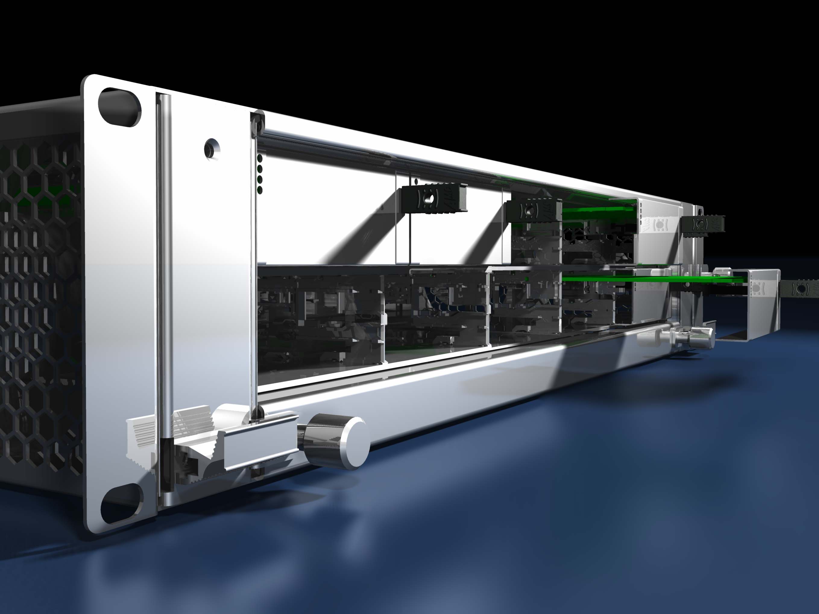 Das PicoTCA-System entspricht in den wichtigsten Kernpunkten der Spezifikation nach PICMG MicroTCA.0 R1.0. Es besteht aus einem 254 mm tiefen 19"-Chassis mit 13 Slots für den Einbau von AMC-Modulen - in den Formfaktoren "Single", "Compact" und "Full-Size" - und MCH (MicroTCA Carrier Hub). Das Chassis ist mit einer integrierten 480 W AC-Stromversorgung ausgestattet und lässt sich mit Steckkarten vorkonfektionieren. Bei größtmöglicher Packungsdichte (W/mm3) unterstützt das System auf kleinstem Raum eine 19 GbE (Gigabit Ethernet)-Übertragung.