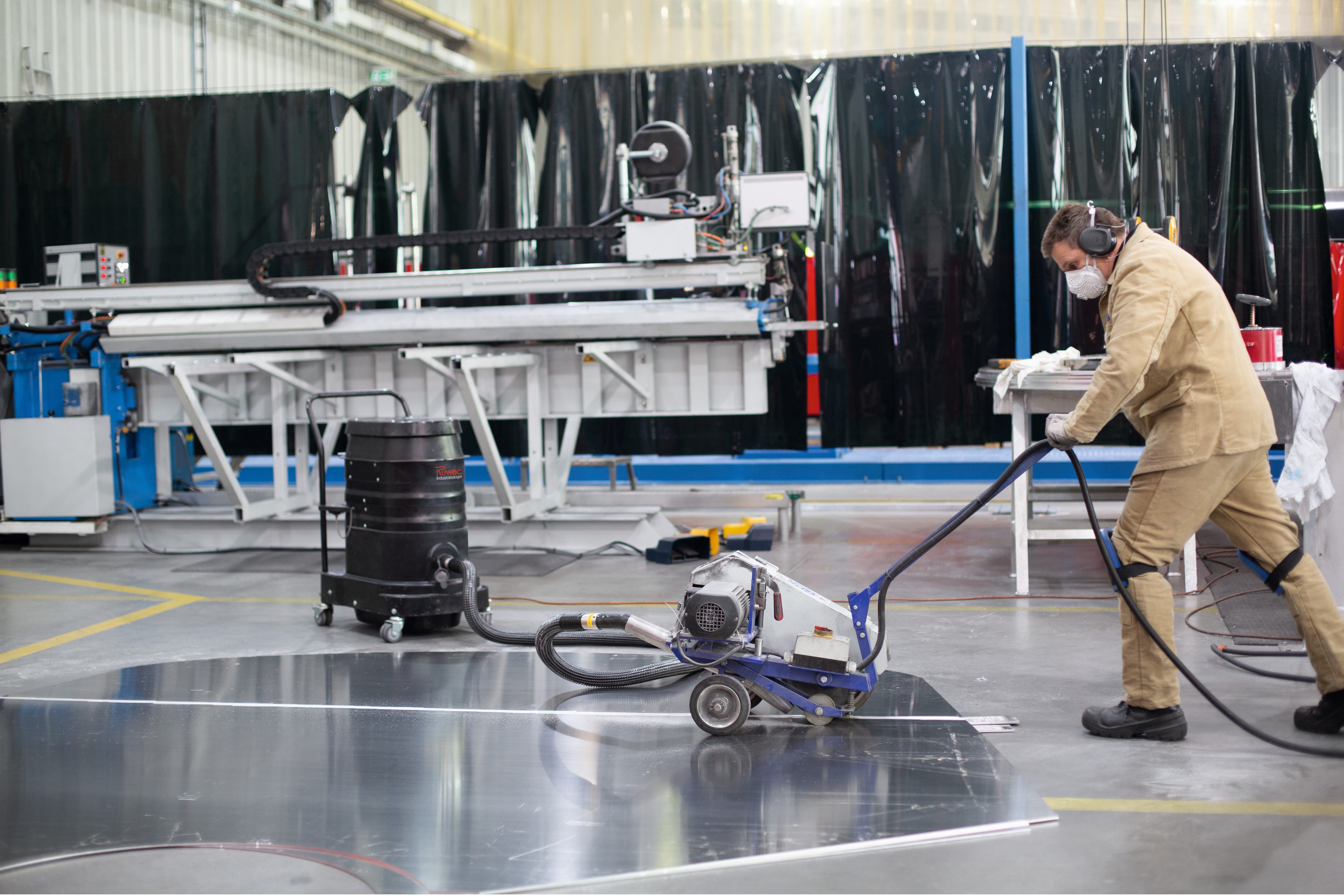Bei der Nachbearbeitung von geschweißten Aluminiumblechen kommt eine mobile Ei-genentwicklung von Feldbinder zum Einsatz – mit integrierter Absaugung.
