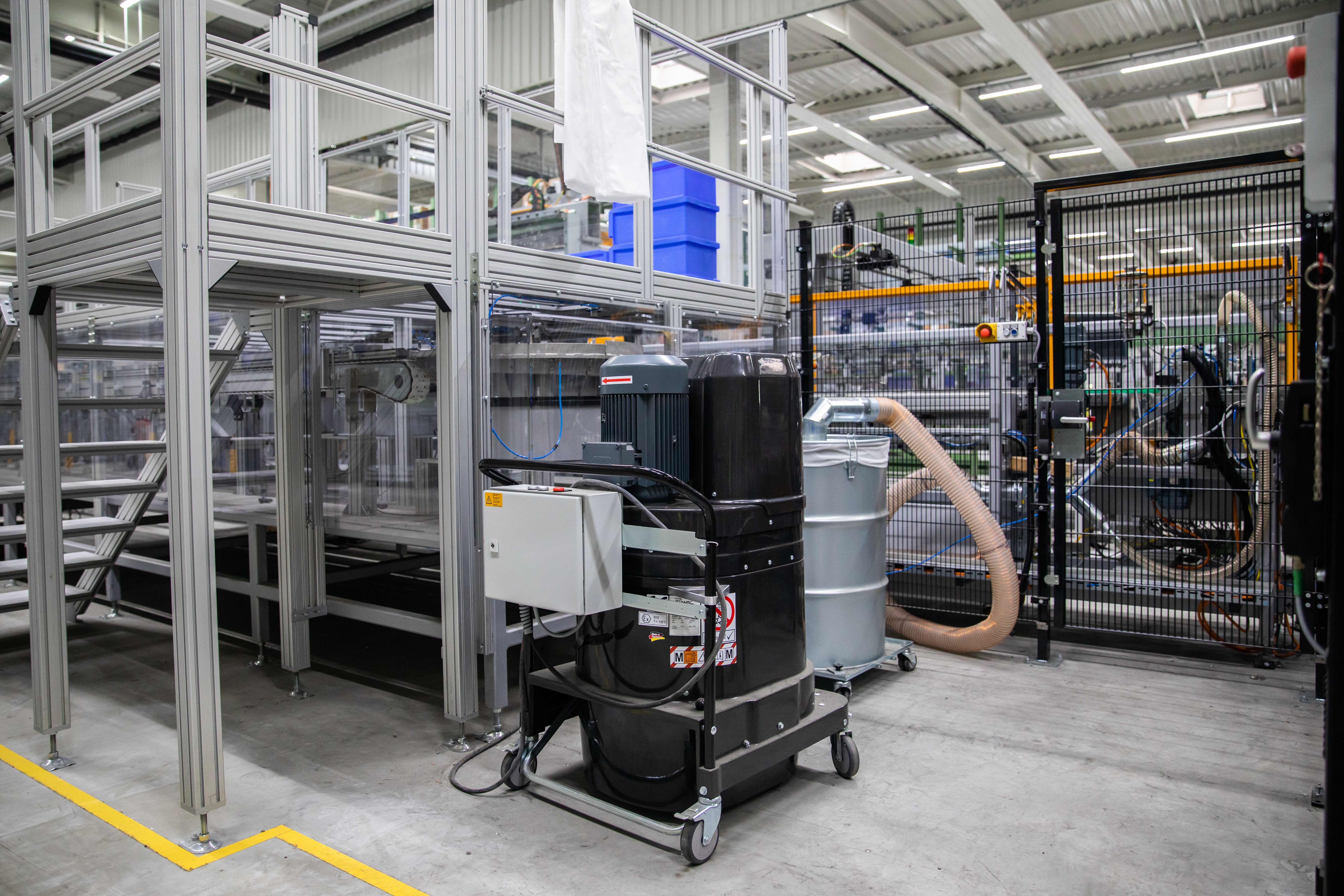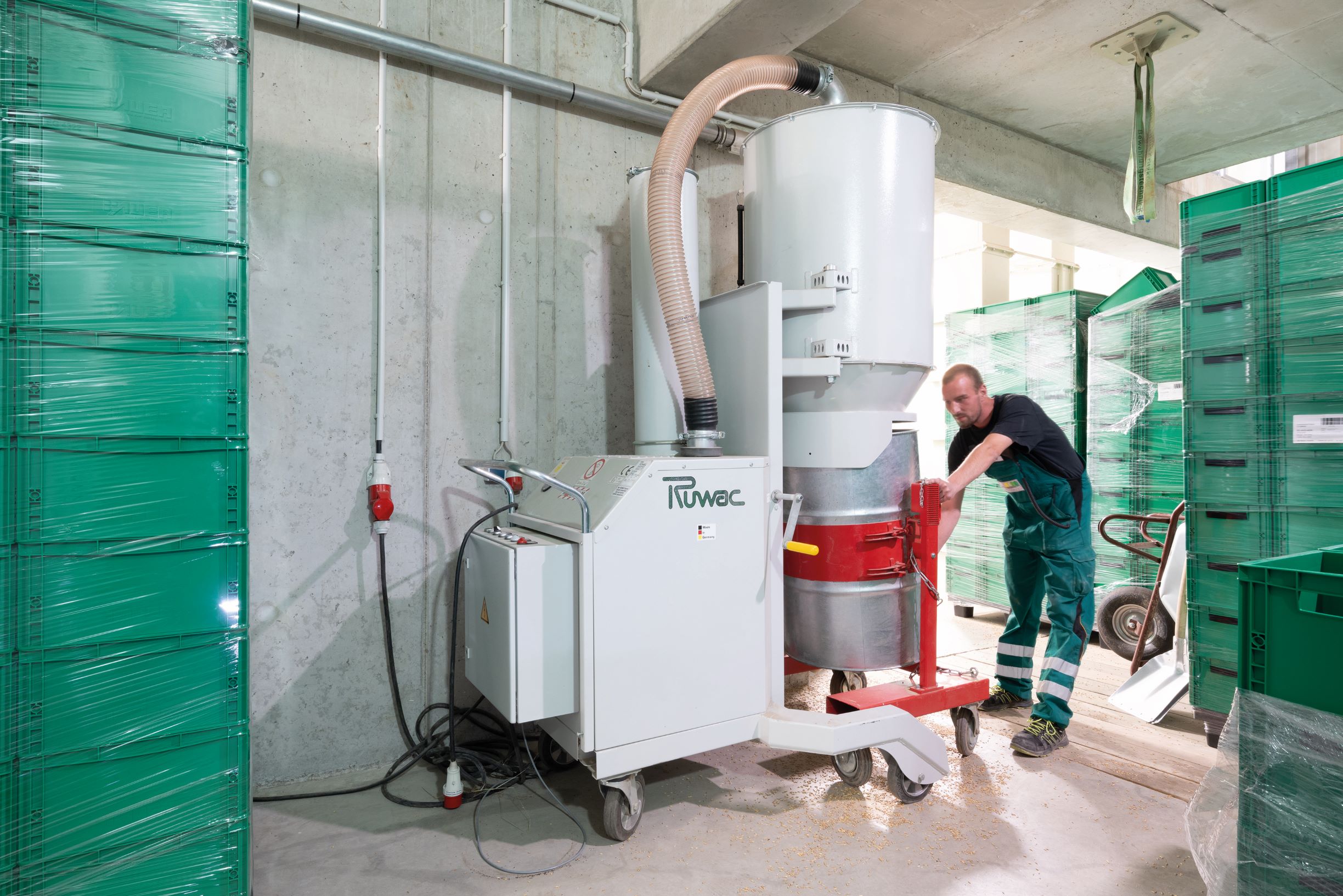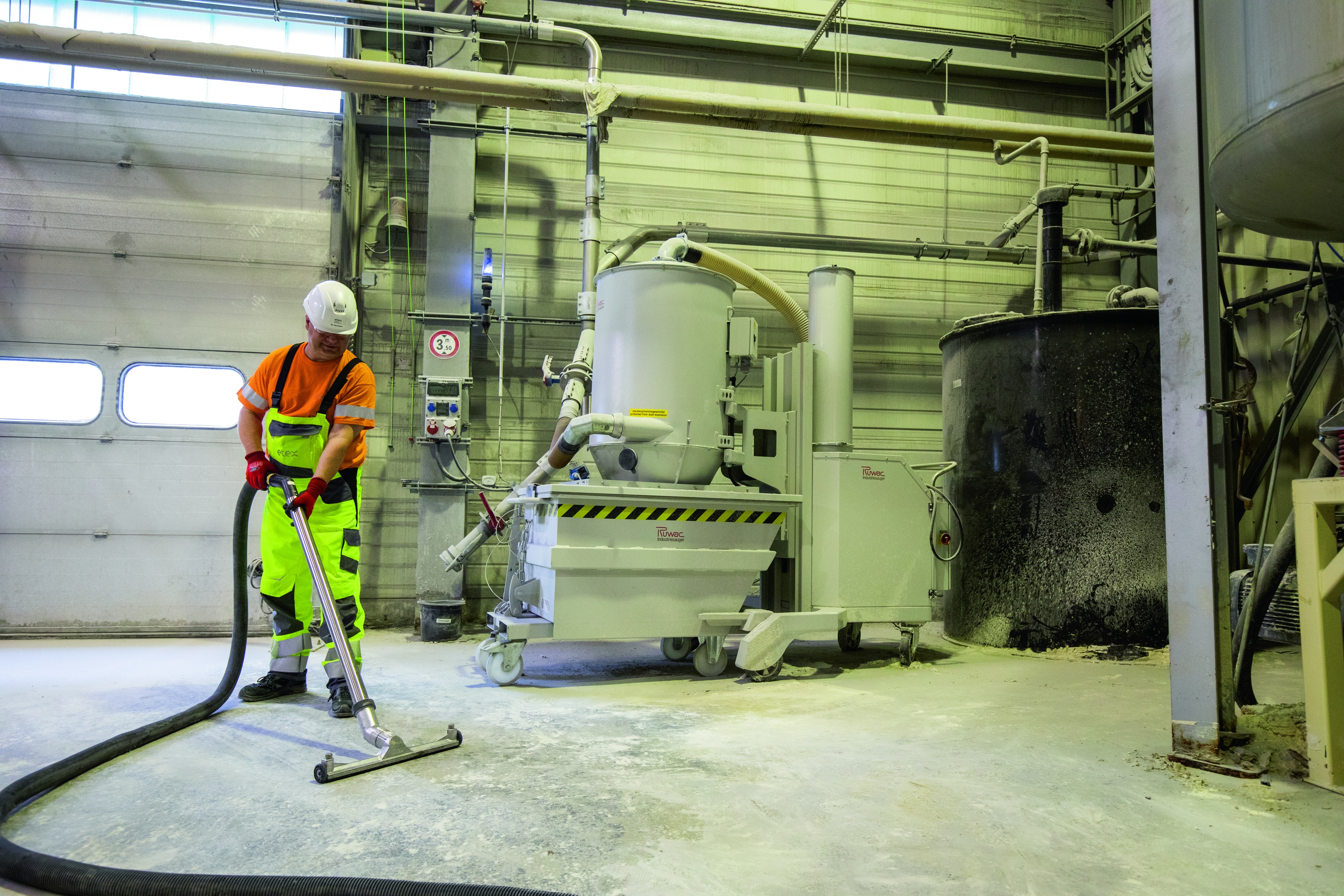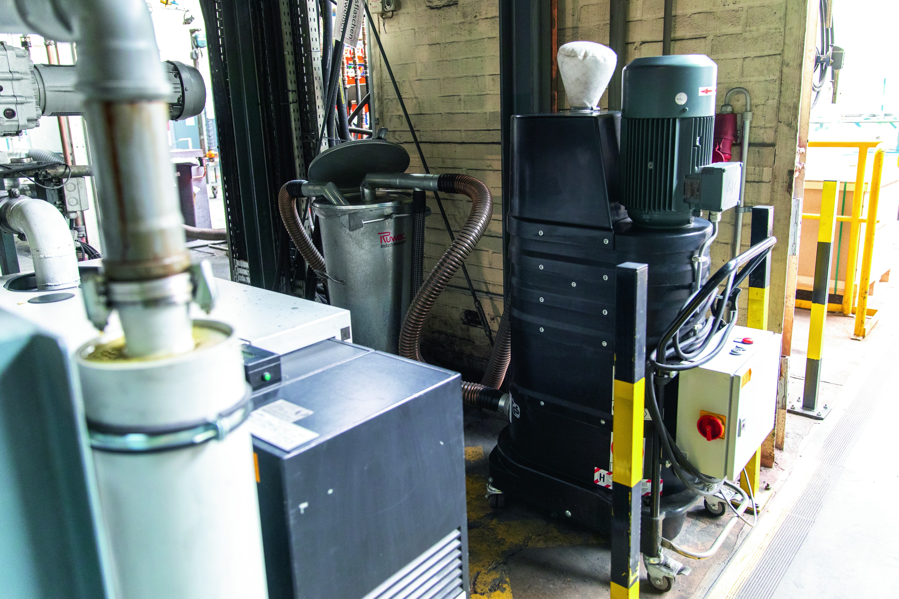 Für die allgemeine Betriebsreinigung werden bei Hörmann in Dissen im ganzen Werk Ruwac-Sauger eingesetzt – natürlich in staubexplosionsgeschützter Ausführung und teilweise, wie hier, mit Vorabscheider.