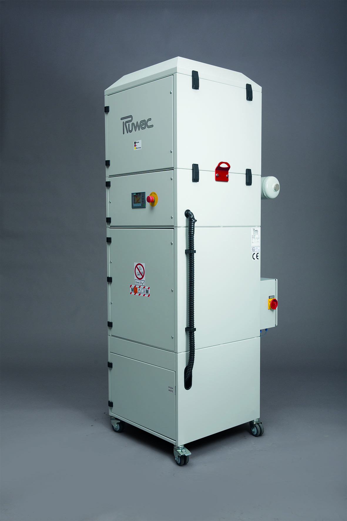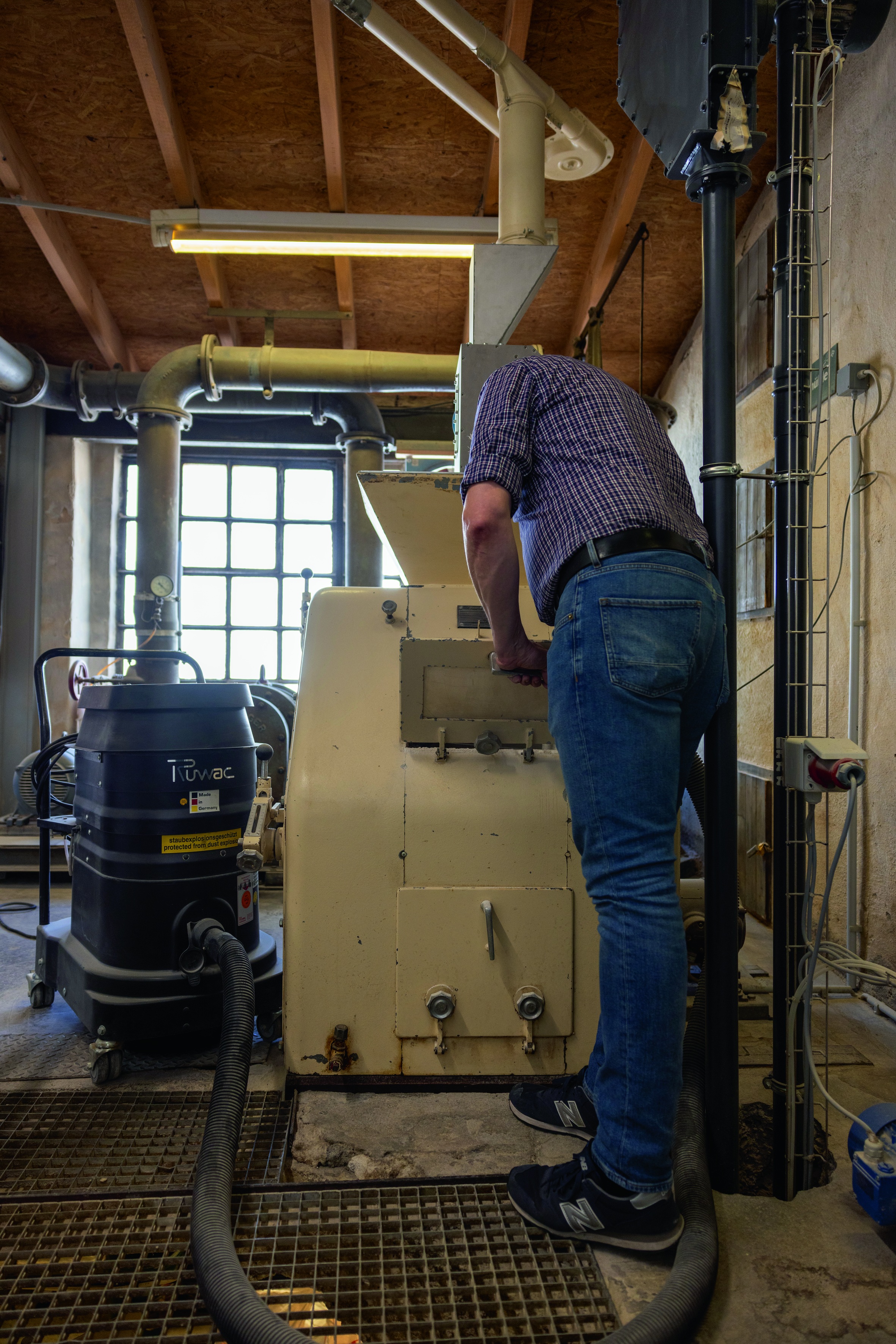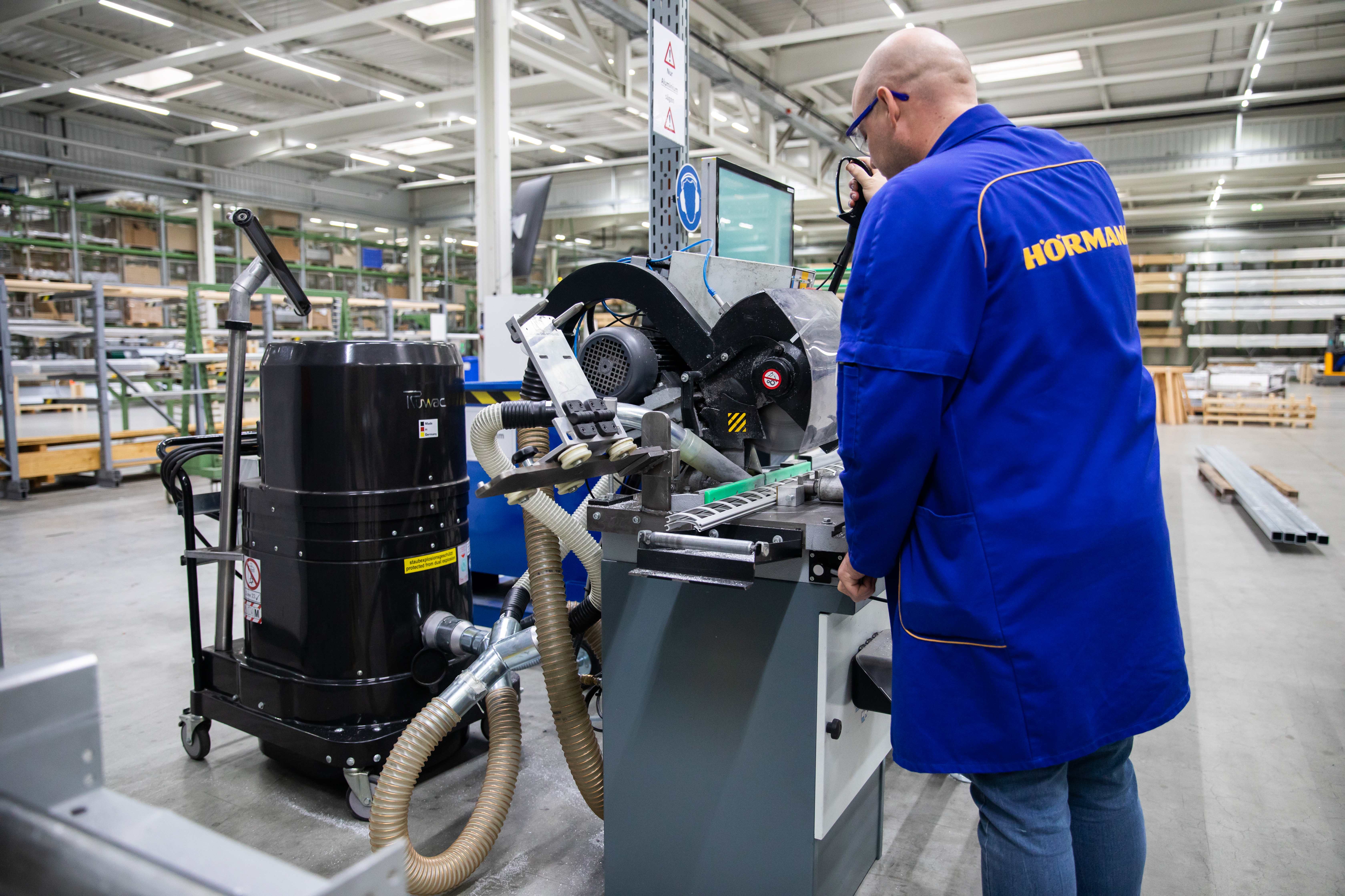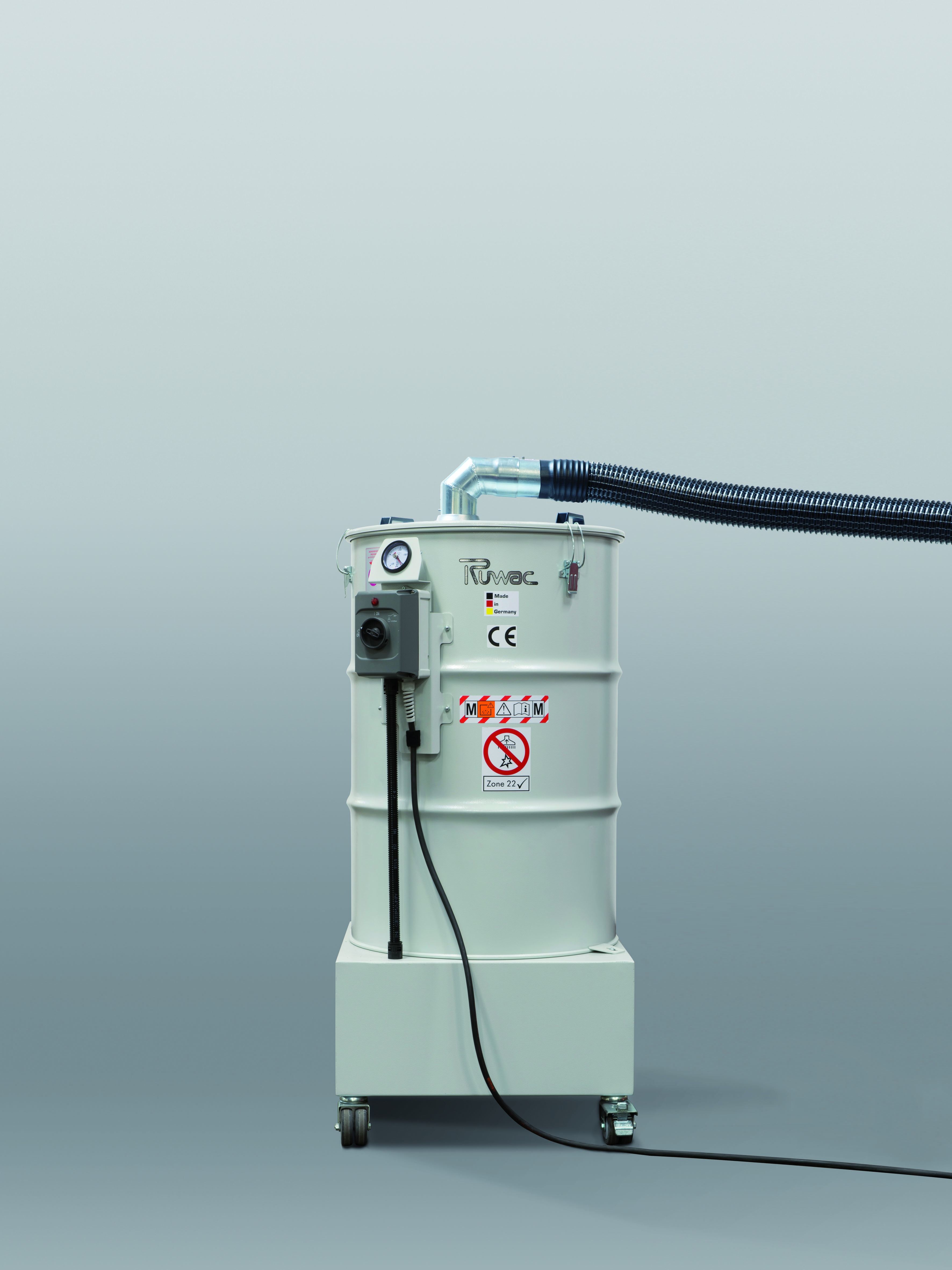 Für die allgemeine Betriebsreinigung werden bei Hörmann in Dissen im ganzen Werk Ruwac-Sauger eingesetzt – natürlich in staubexplosionsgeschützter Ausführung und teilweise, wie hier, mit Vorabscheider.
