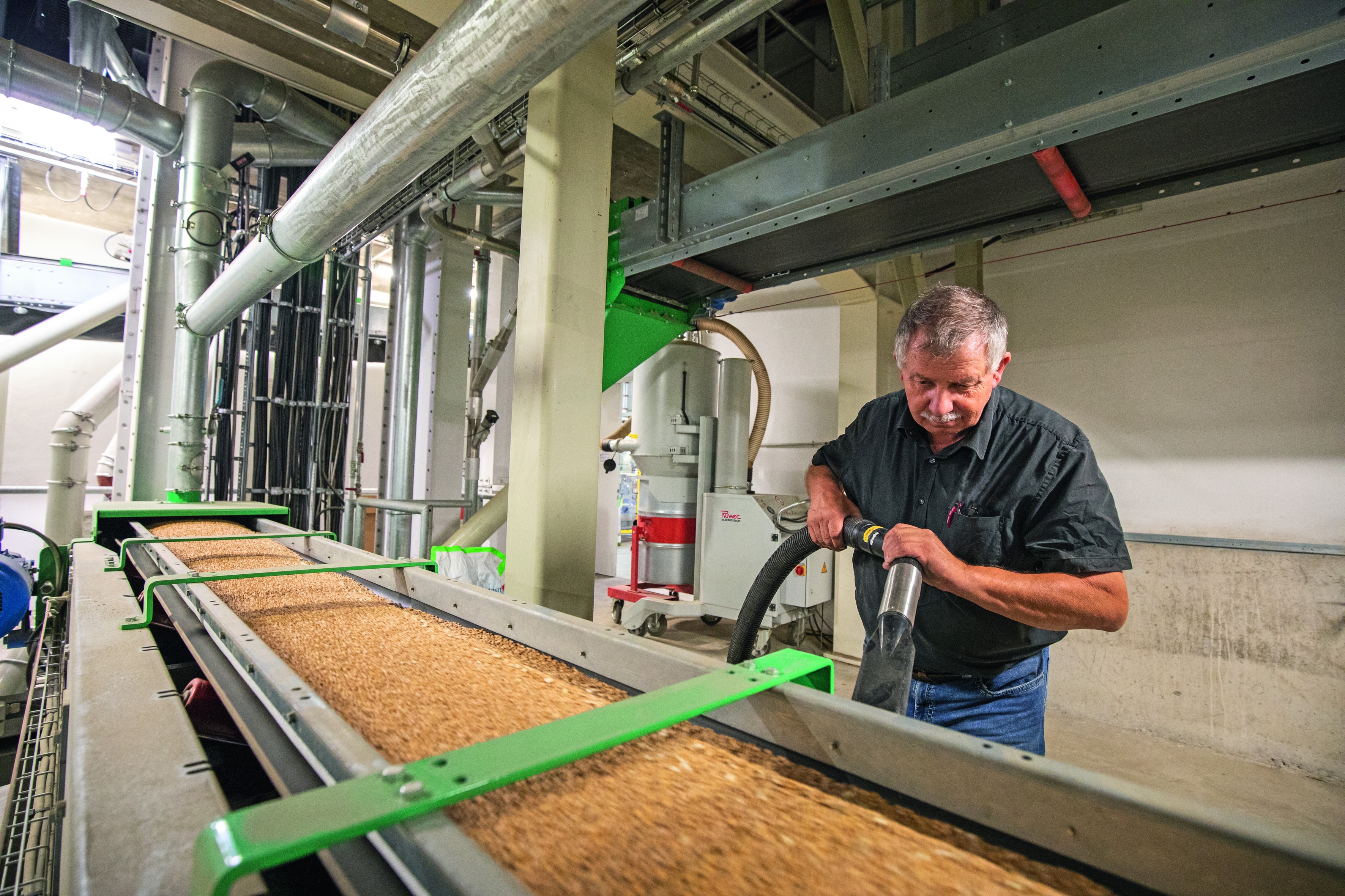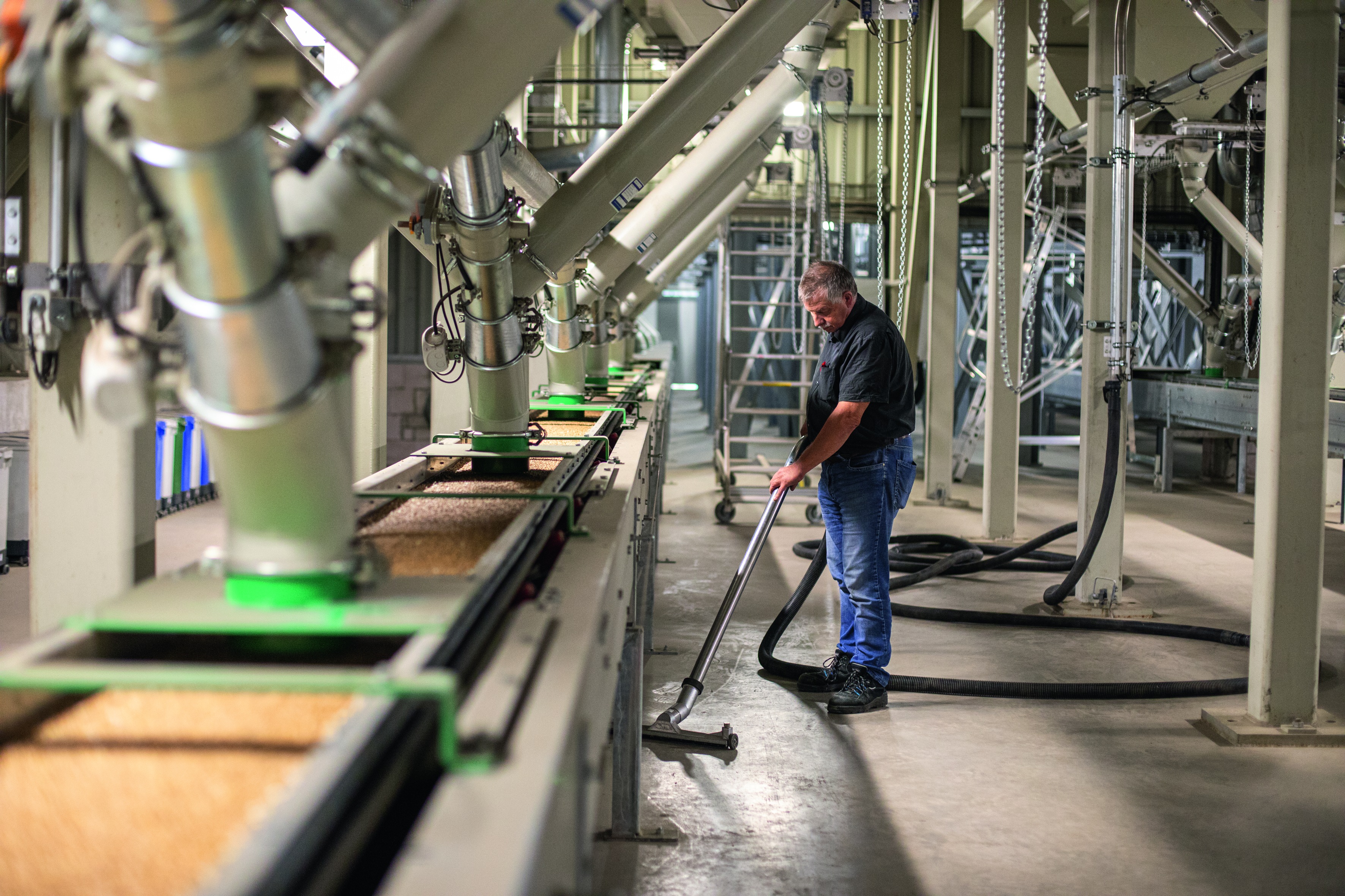 Blick auf das Fördersystem der Saatgutaufbereitung. Im Hintergrund: die zentrale Absauganlage.