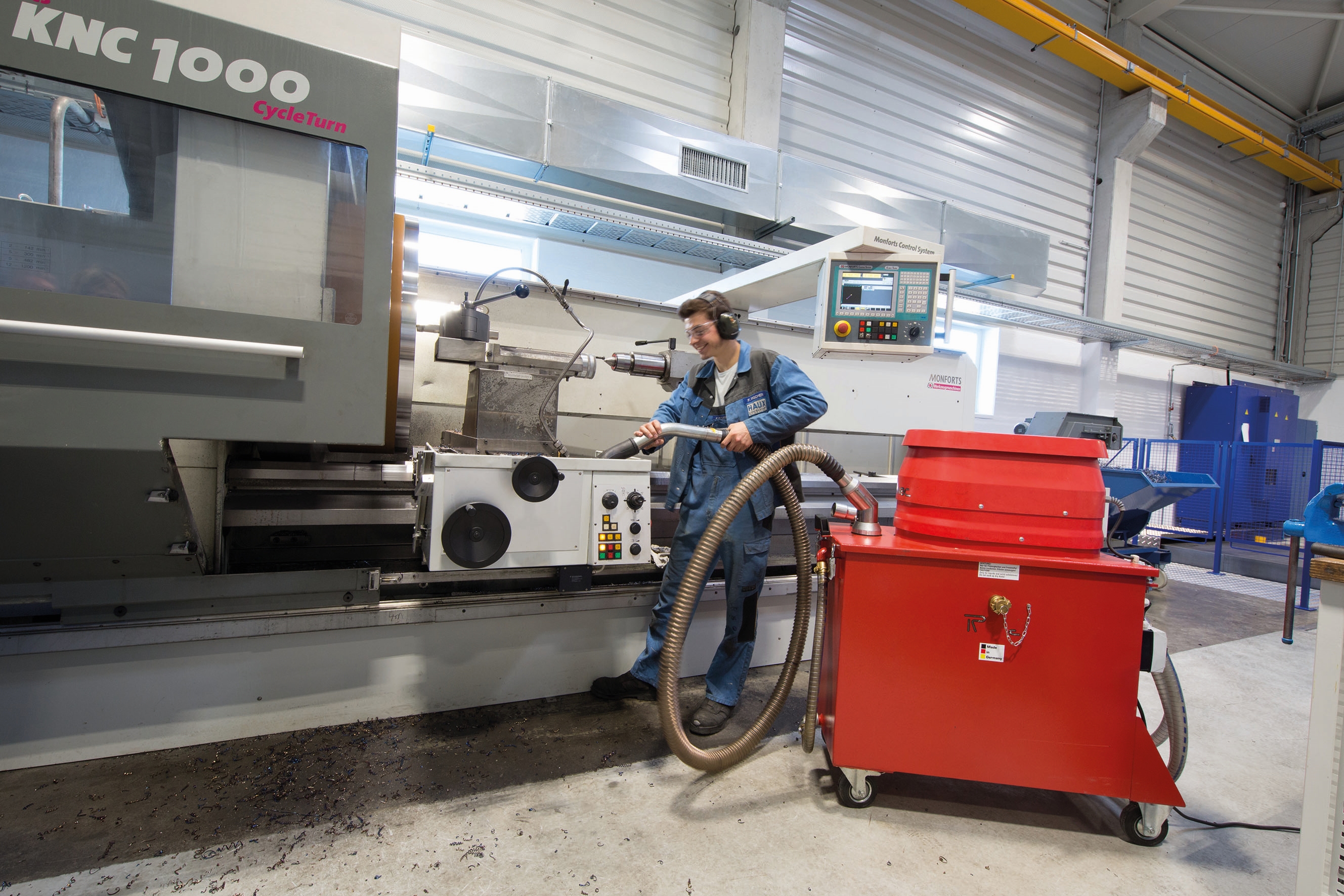 Der mobile und kundenspezifische Spänesauger im SPAX-Werk Gevelsberg er-laubt das Absaugen von Kühlschmierstoff an allen Produktionsanlagen in der Hal-le.
