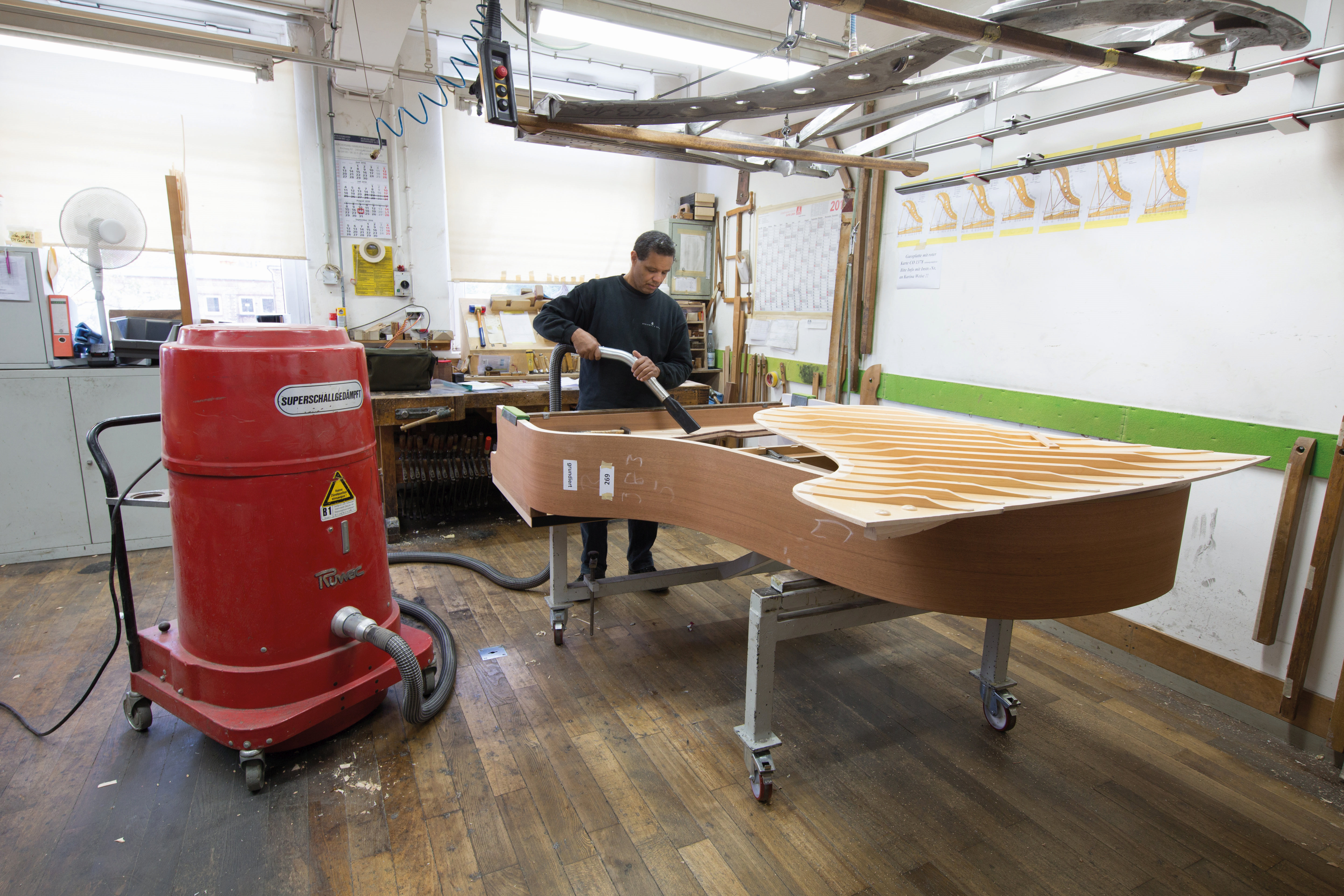 Die in Hamburg gefertigten Steinway-Flügel bestehen aus bis zu 12.000 Einzeltei-len. An zahlreichen Arbeitsplätzen der Manufaktur sind Ruwac-Sauger im Einsatz.