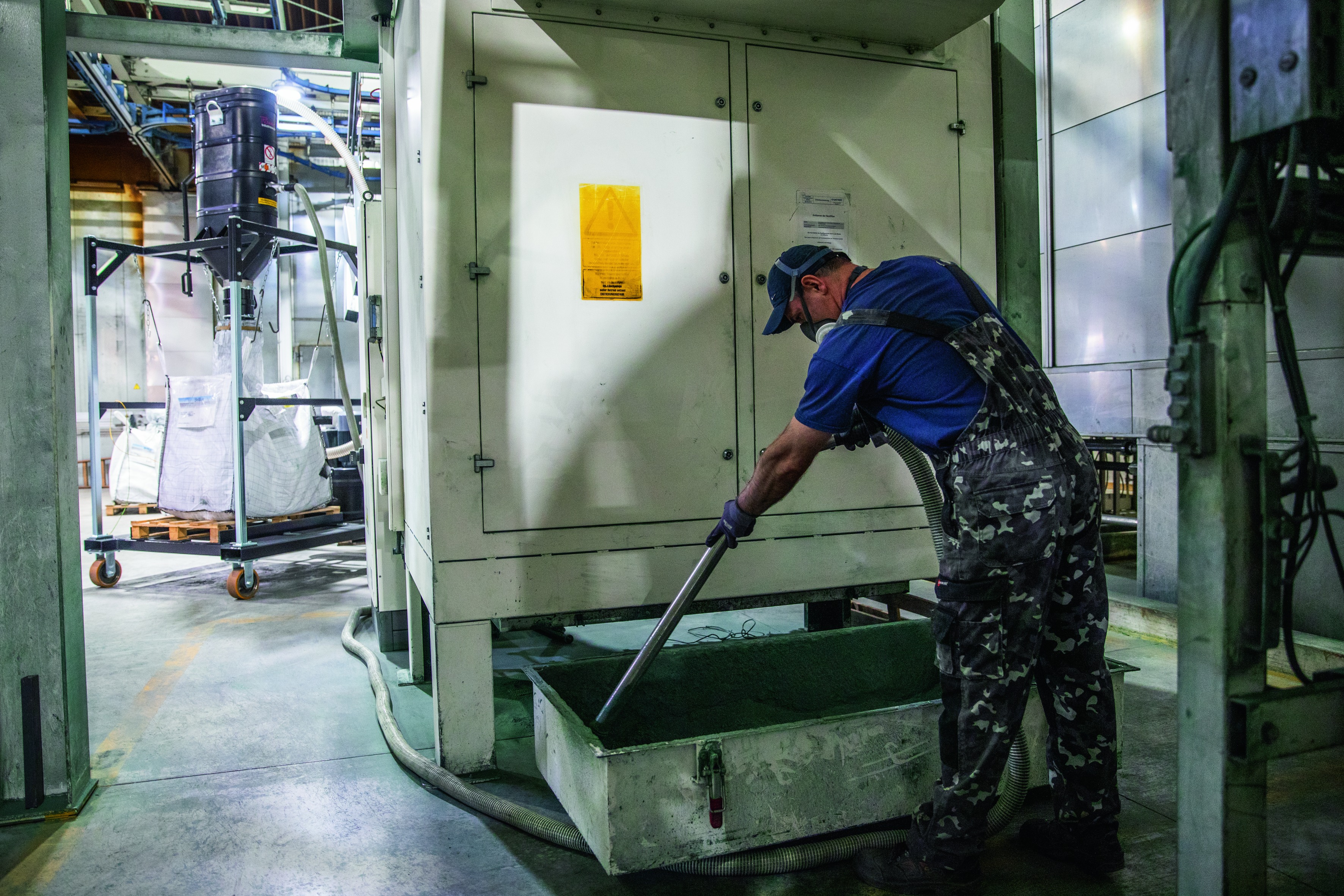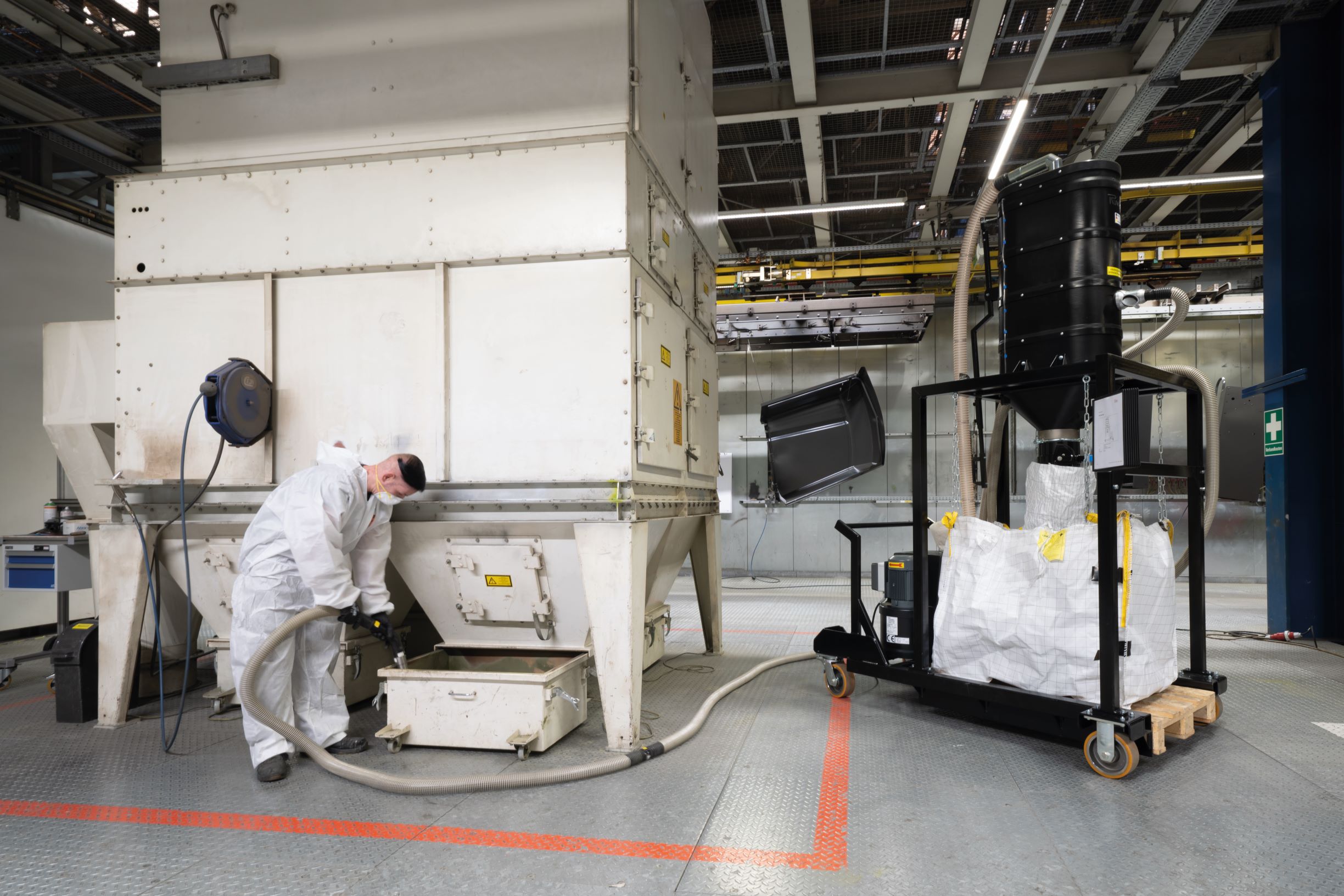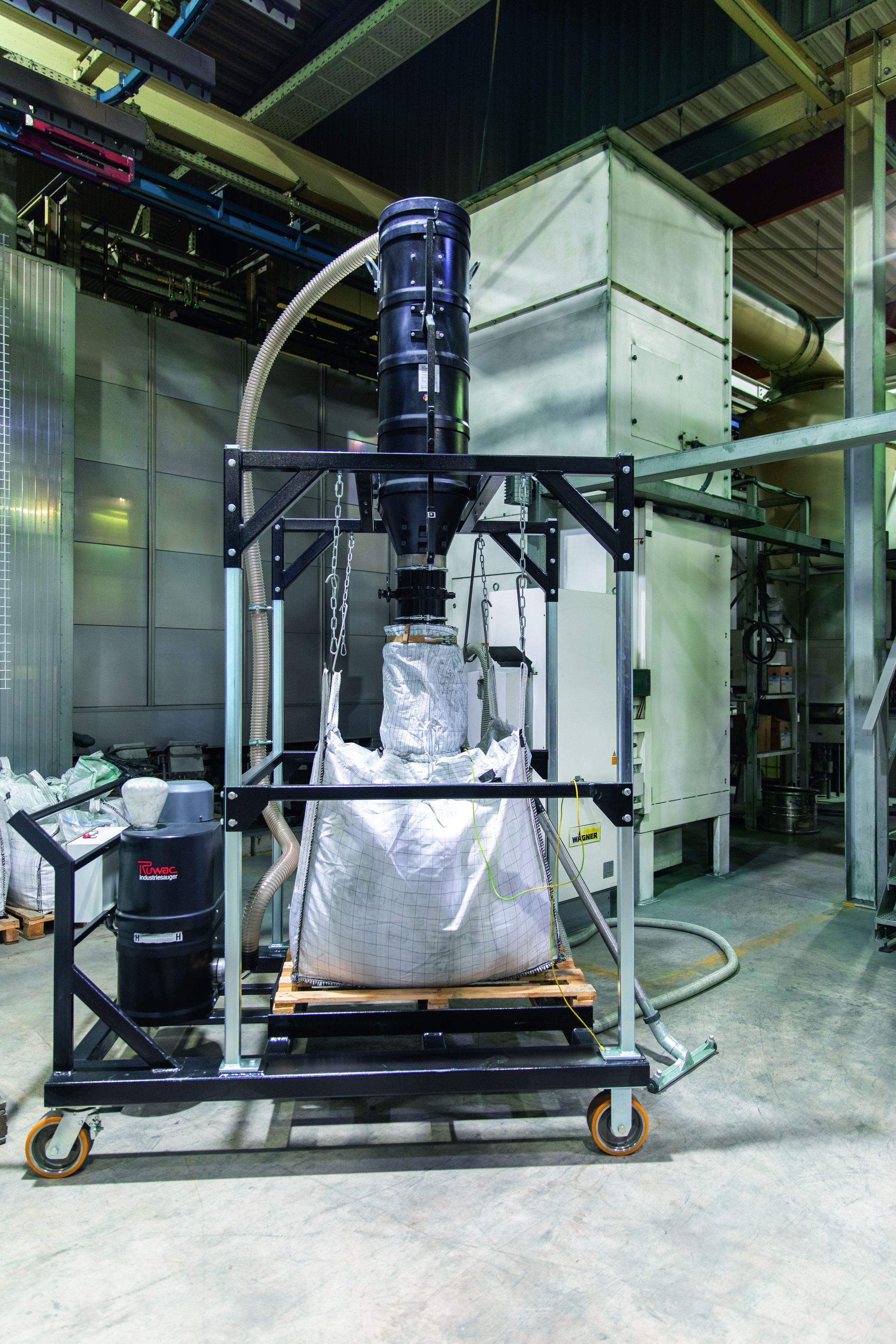 Der maßgeschneiderte Sauger bei COATINQ Castrop-Rauxel sammelt das Rest-pulver in Big-Bags.