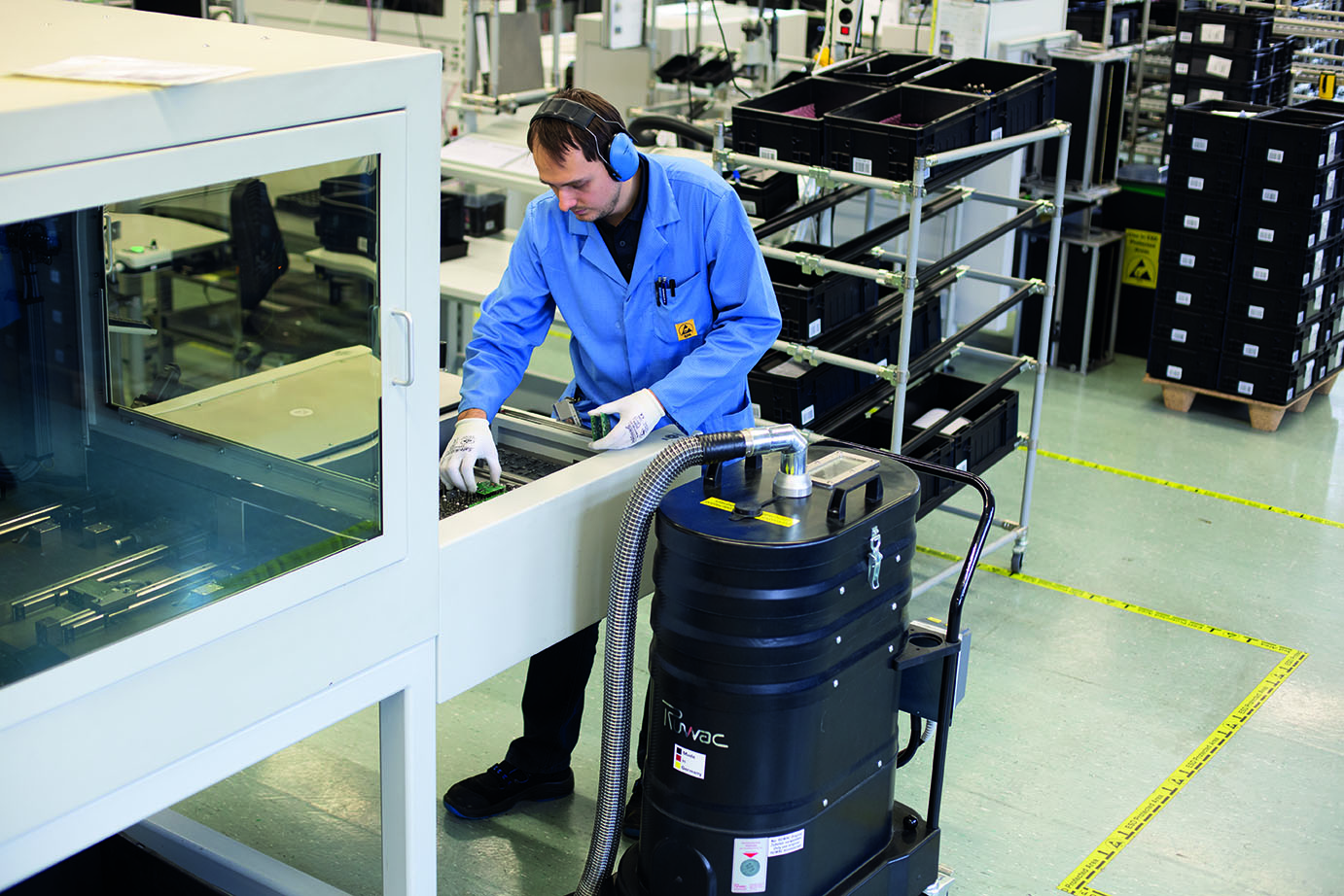 Bei der manuellen Nutzentrennung von Leiterplatten für kleinere Produktionsmengen setzt Schmersal einen Staub-Ex-Sauger ein, der mit zwei Schneidanlagen verbunden ist.