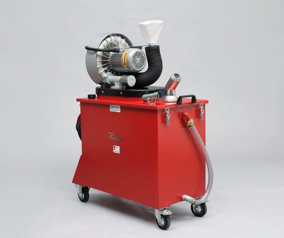 Die Sauganlage (mit Vorabscheider) ist grundsätzlich mobil, befindet sich aber meist an einem festen Platz, von dem aus zwei Gießanlagen erreicht werden können