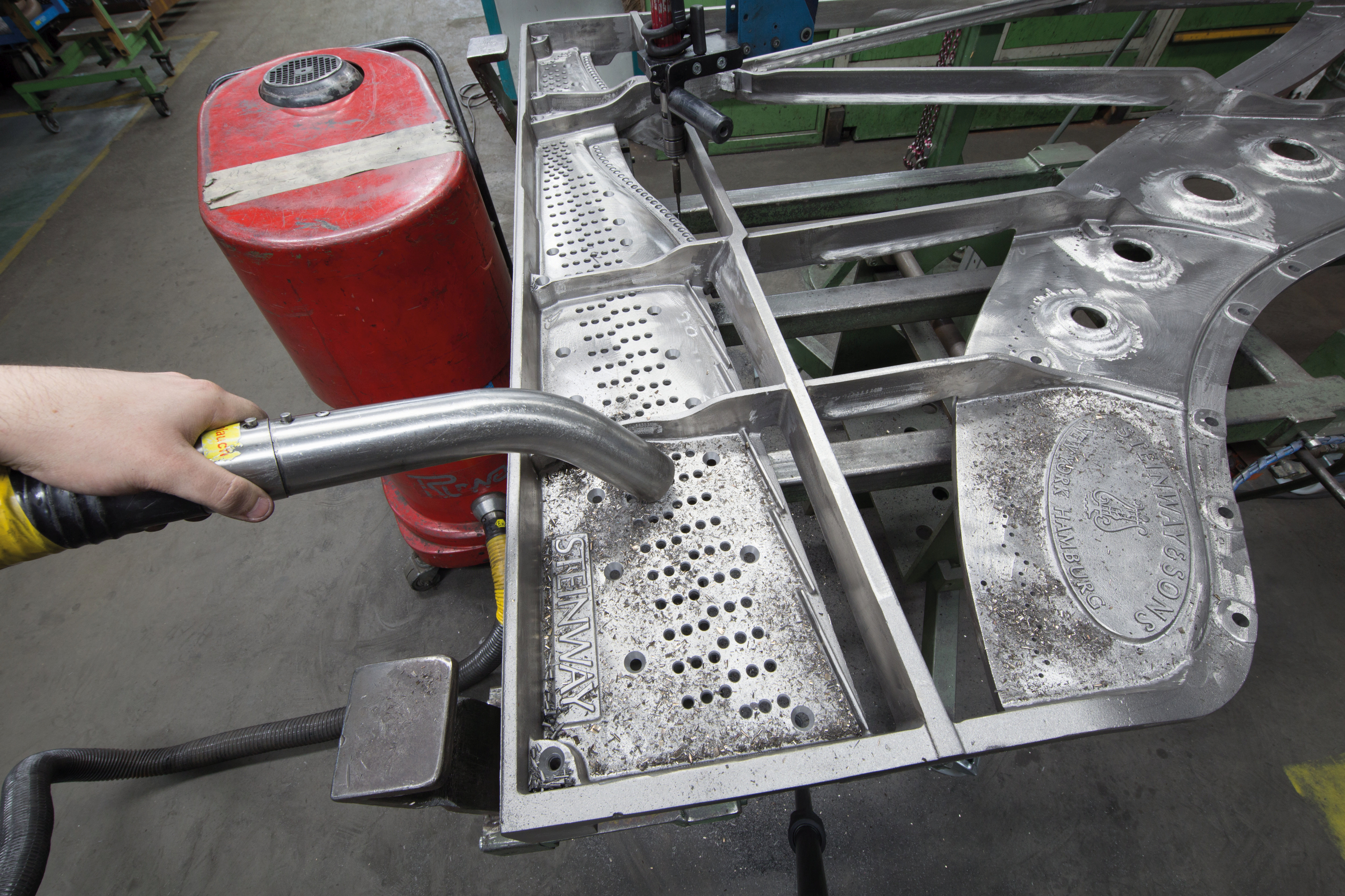 Die meisten Ruwac-Sauger bei Steinway & Sons saugen Holzspäne und –staub. Aber auch nach der Bearbeitung der Gussplatte werden sie benötigt. Der hier ab-gebildete Sauger ist mehr als dreißig Jahre alt.