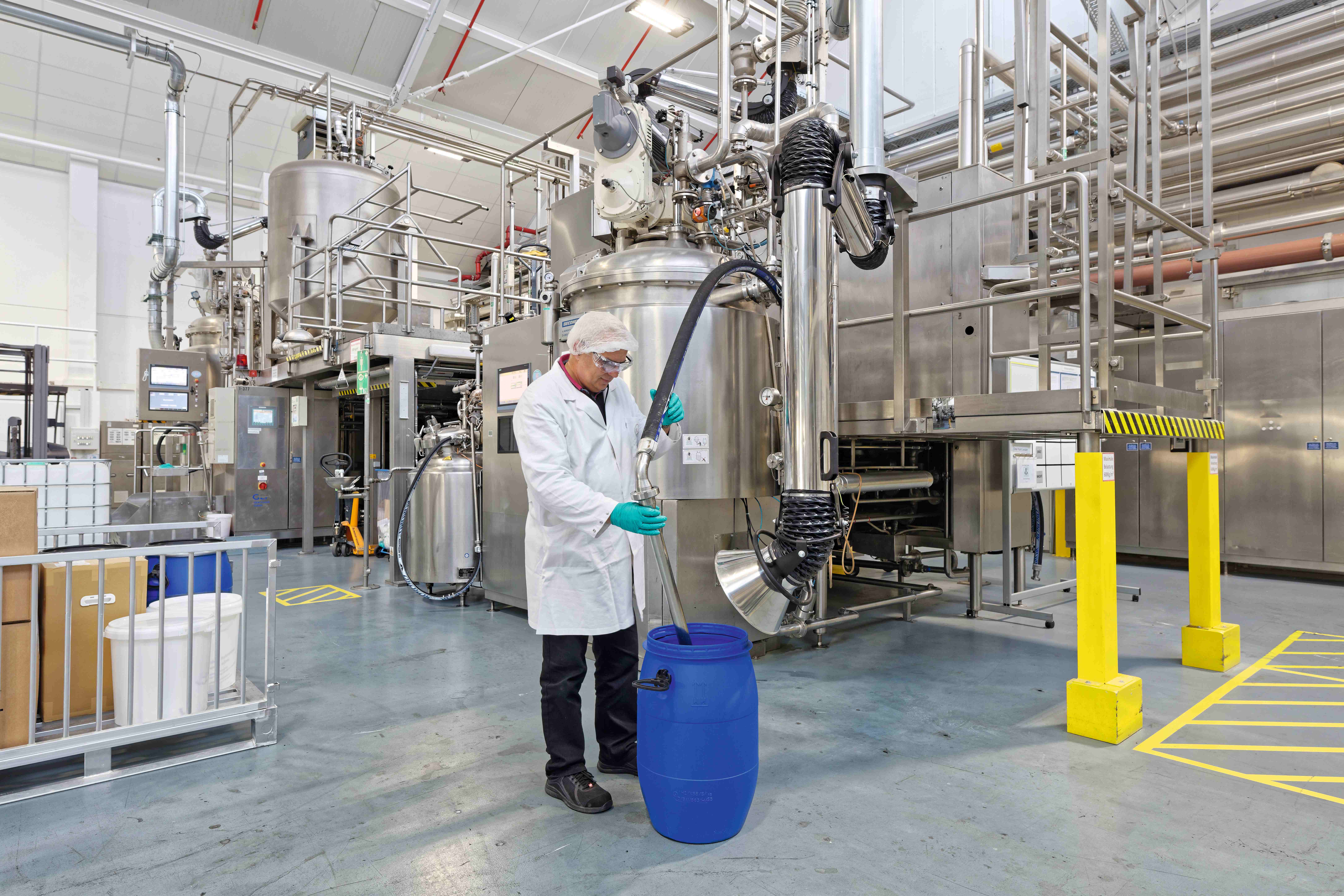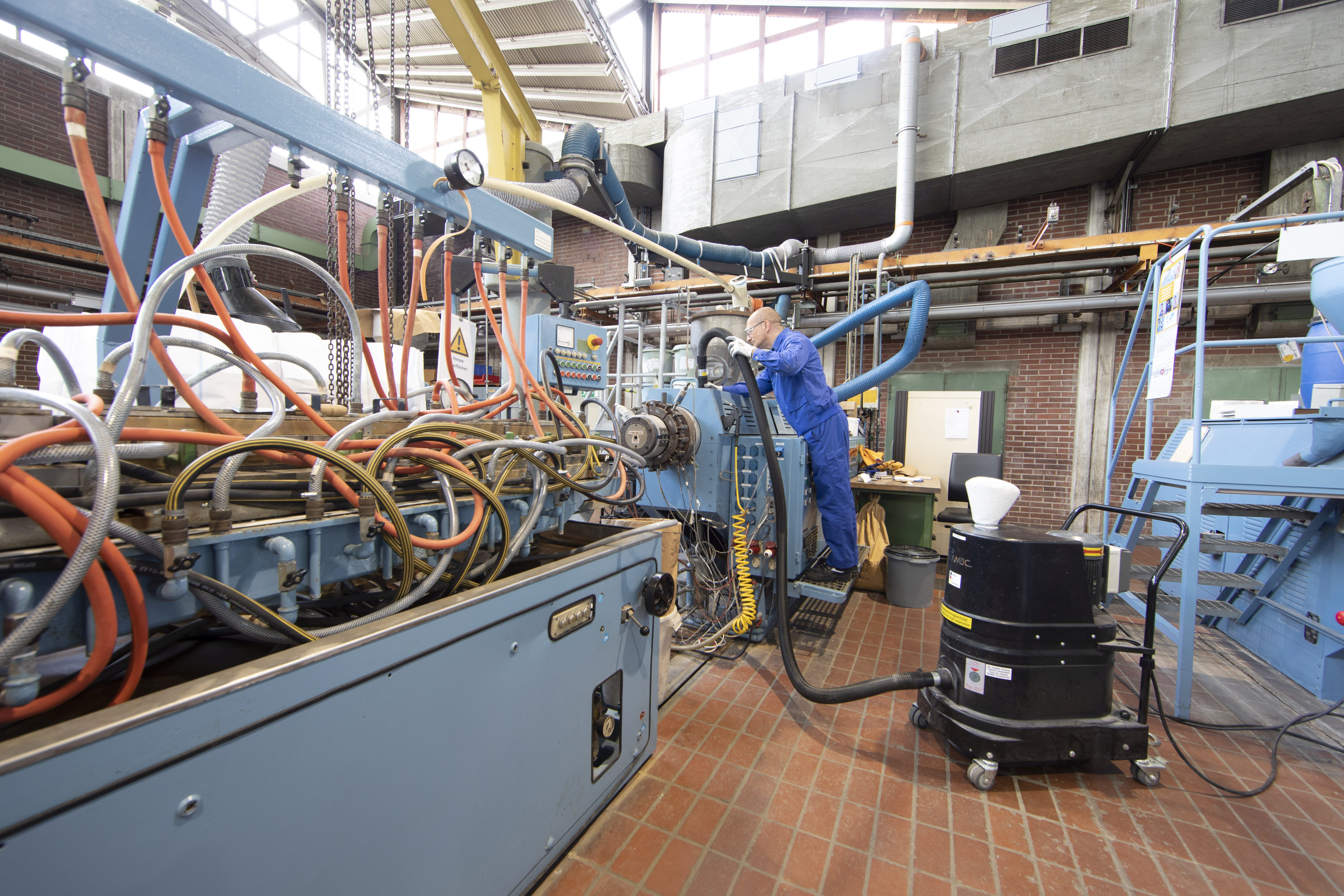 Reinigungsarbeiten an der Compoundieranlage. Hier werden die neuen Material-präparationen erzeugt.
