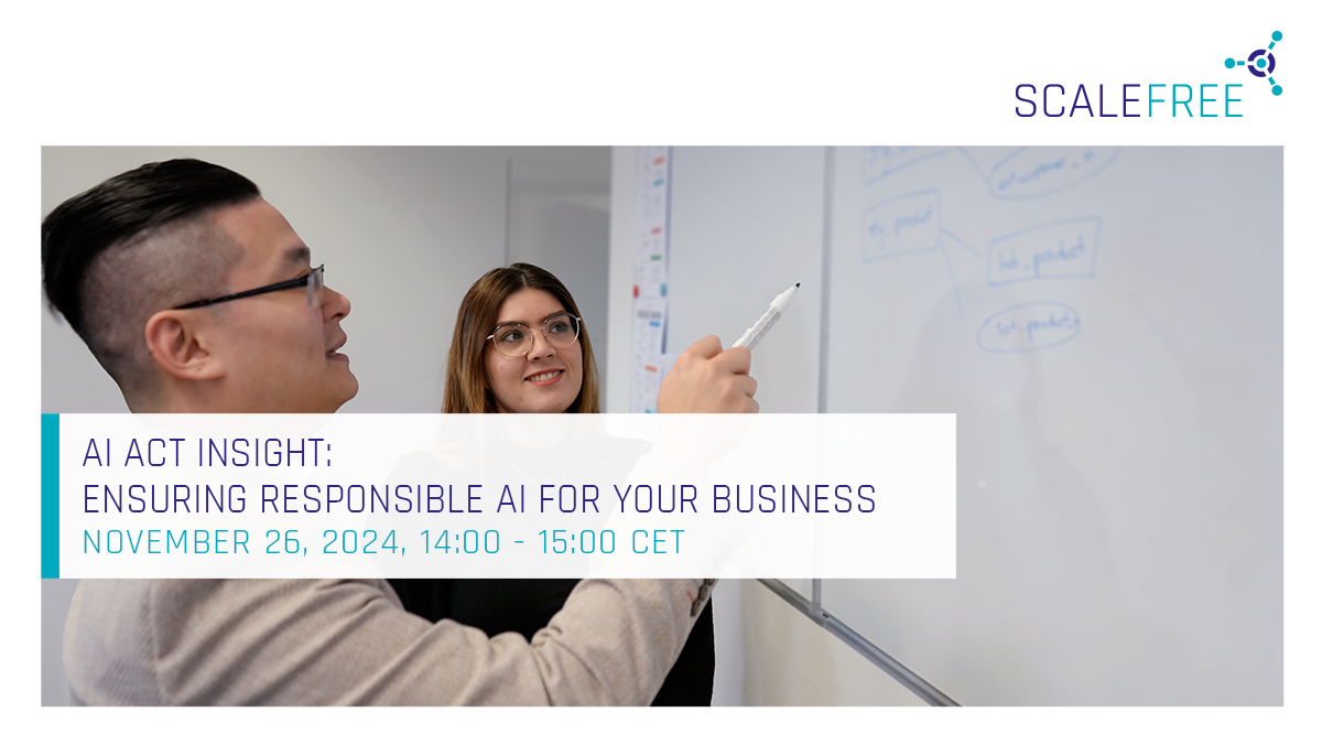 This image is a promotional graphic for a webinar focused on the European Union's AI Act. It is by Scalefree with the title AI Act Insights: Ensuring Responsible AI for Your Business. It takes place on November 26, 14:00 CET. In the background is a man and a woman at a whiteboard.