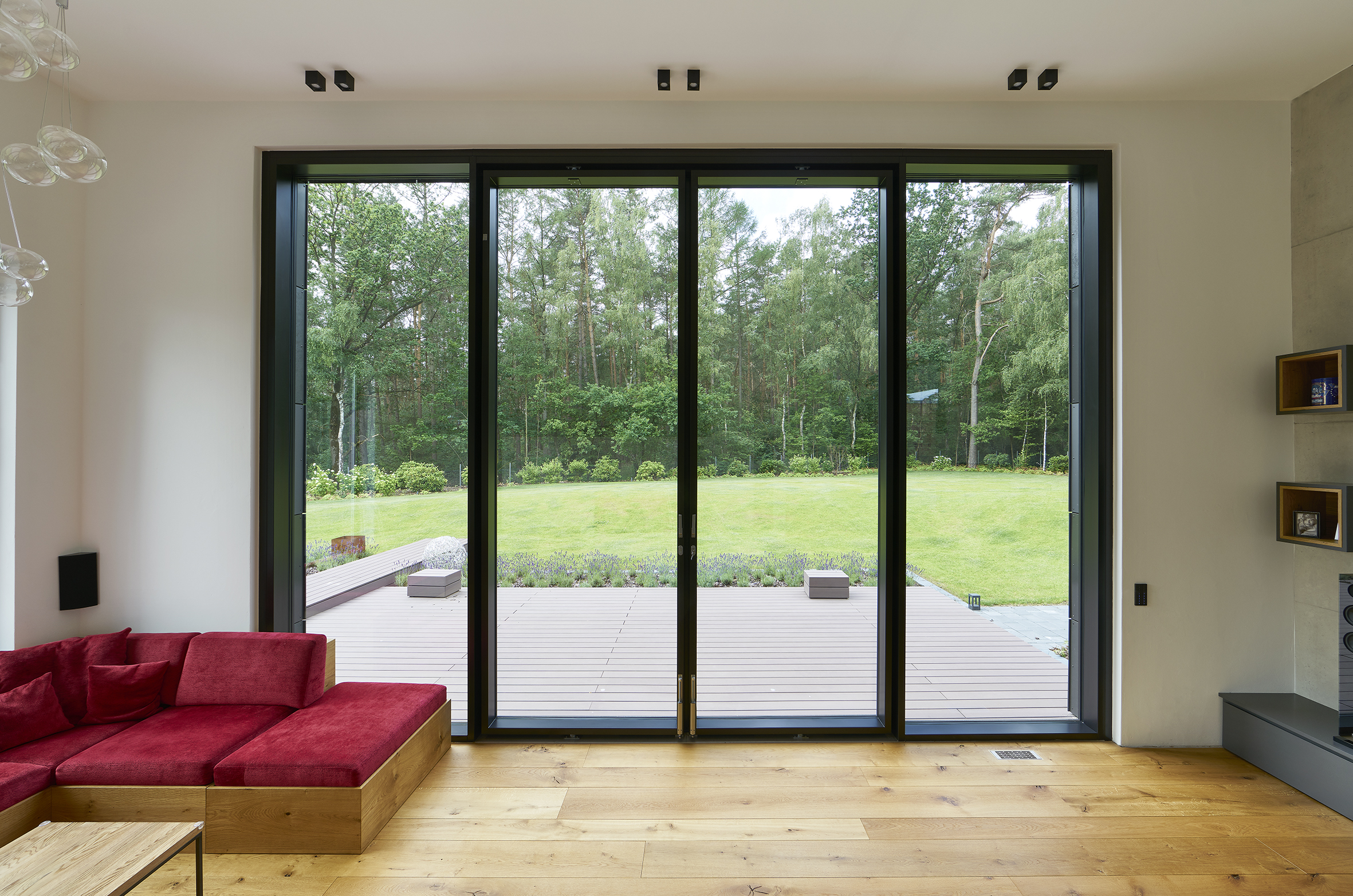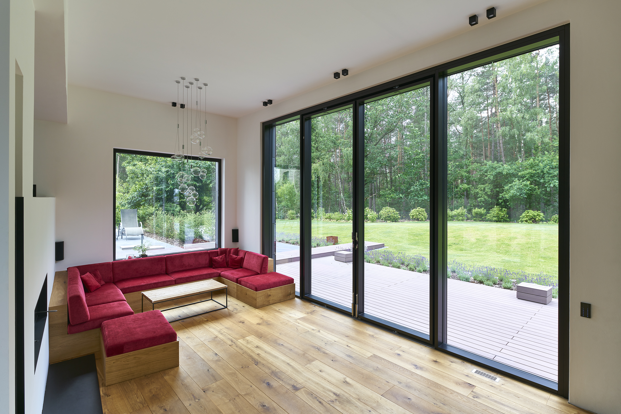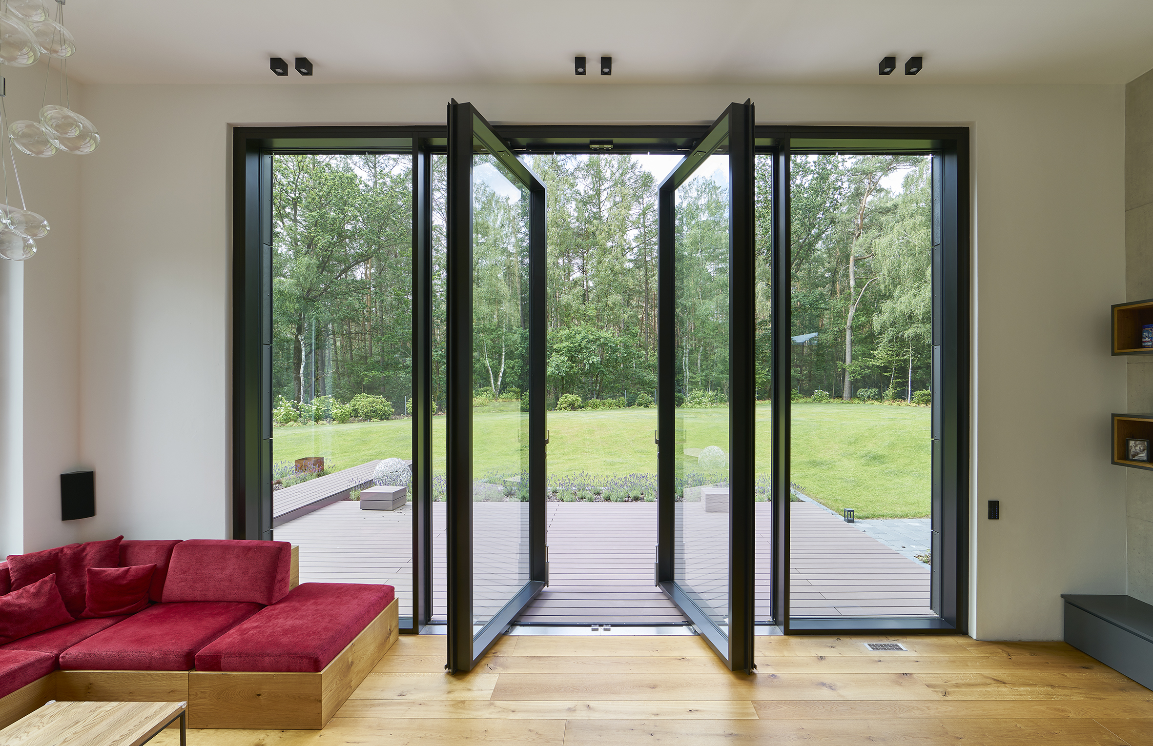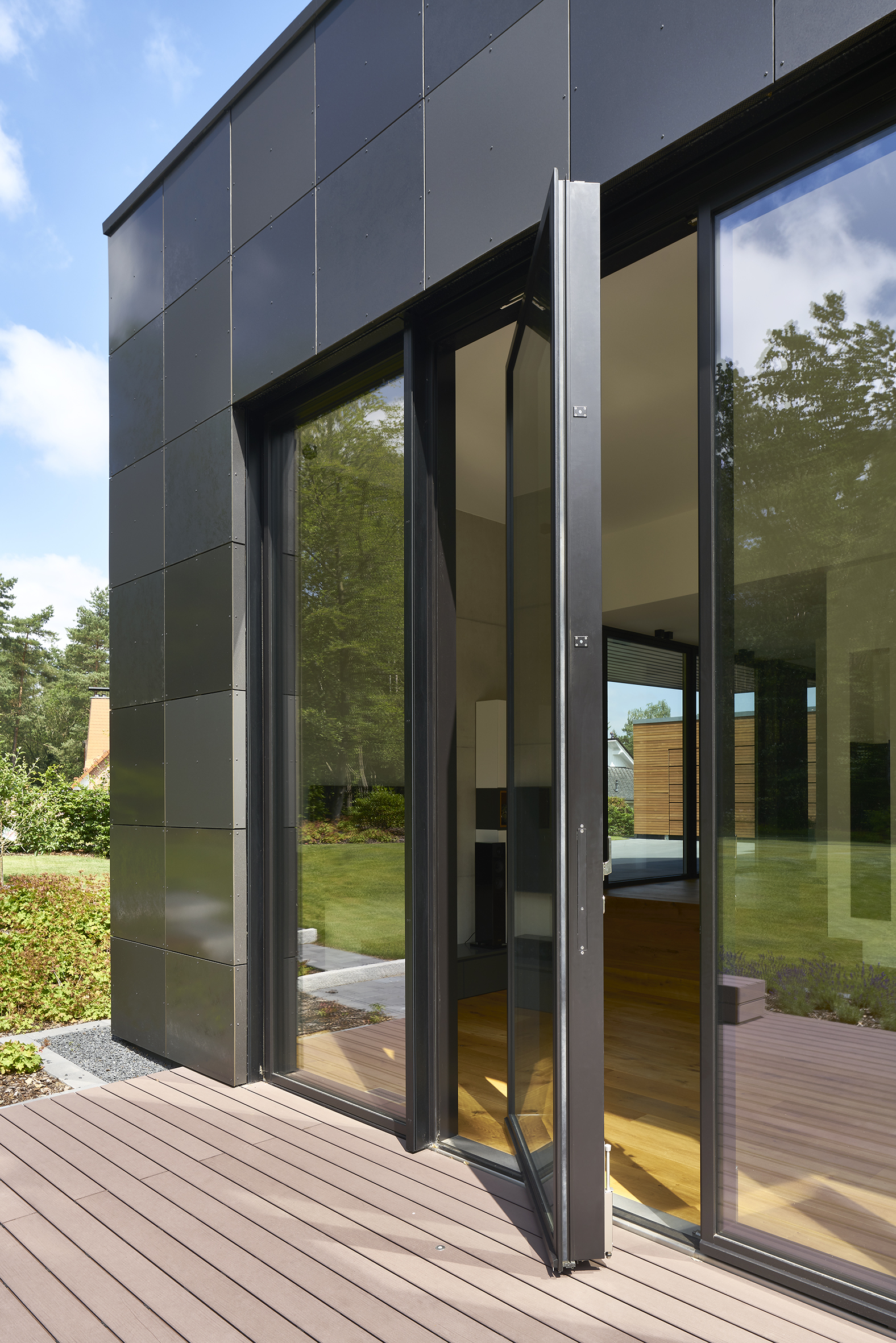 Der abgesenkte Wohnbereich, in der Fassade mit quadratischen Trespa-Platten in zwei Anthrazit-Tönen gekleidet, ist gekennzeichnet durch seine spektakuläre Raumhöhe von fünf Metern. Dieser außerordentlichen Raumwirkung angemessen ist der Lichtausschnitt zur Terrasse und dem hinter dem Haus gelegenen Wald hin. Hierbei handelt es sich um ein 6,05 x 4,20 m (B x H) großes Stahl-Fassadenelement in Pfosten-Riegel-Bauweise, System VISS 50, das aus vier Segmenten mit identischen Abmessungen besteht. Im Zentrum des Elements ist eine vier Meter hohe zweiflügelige Drehtür integriert, die barrierefrei zur Terrasse hinaus führt. Die Architektin wählte bewusst eine Pfosten-Riegel-Konstruktion in Stahl-Profilbauweise, da nur auf diese Weise die gewünschten, von Querriegeln freien Feldabmessungen realisierbar waren.
