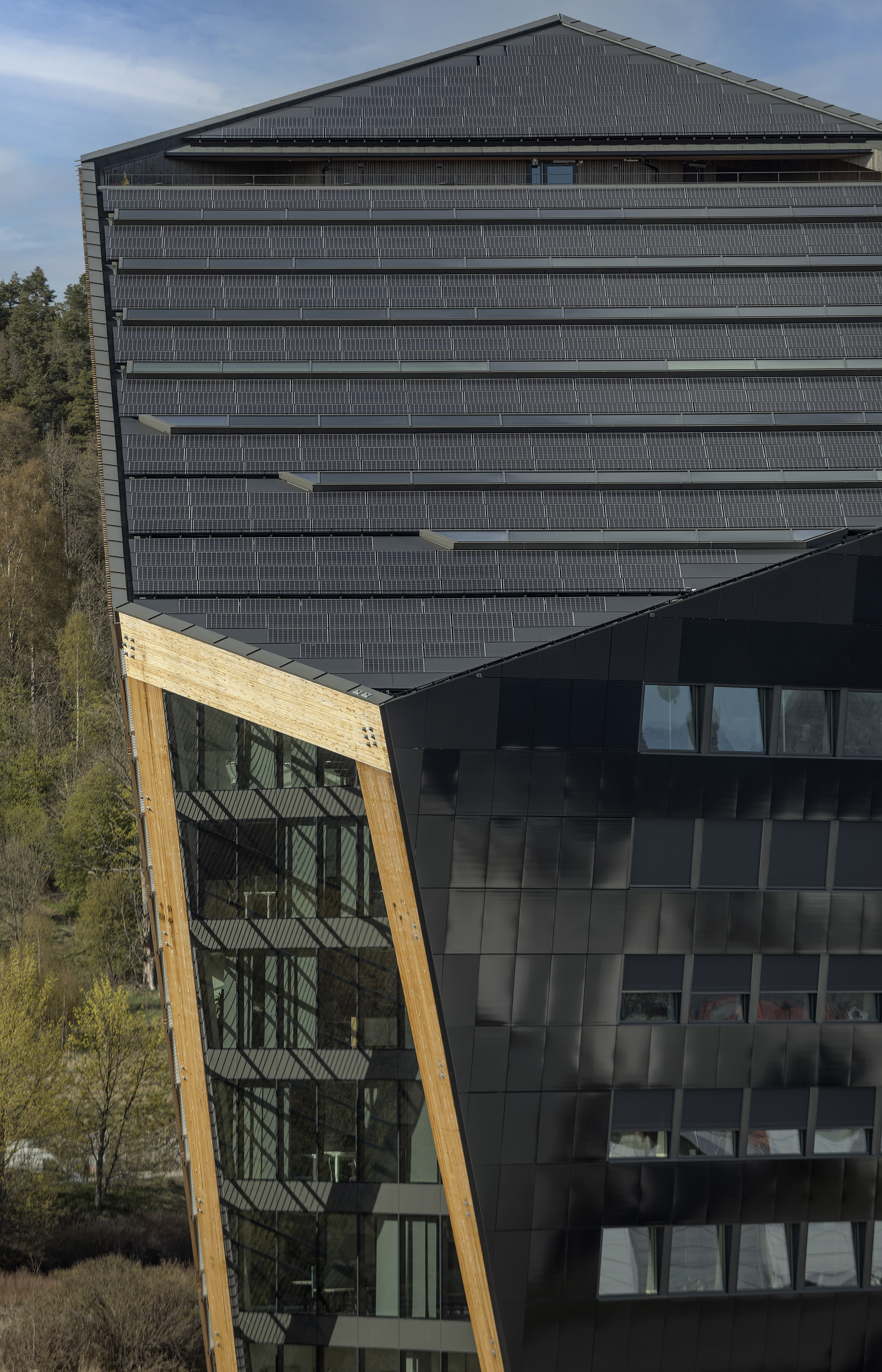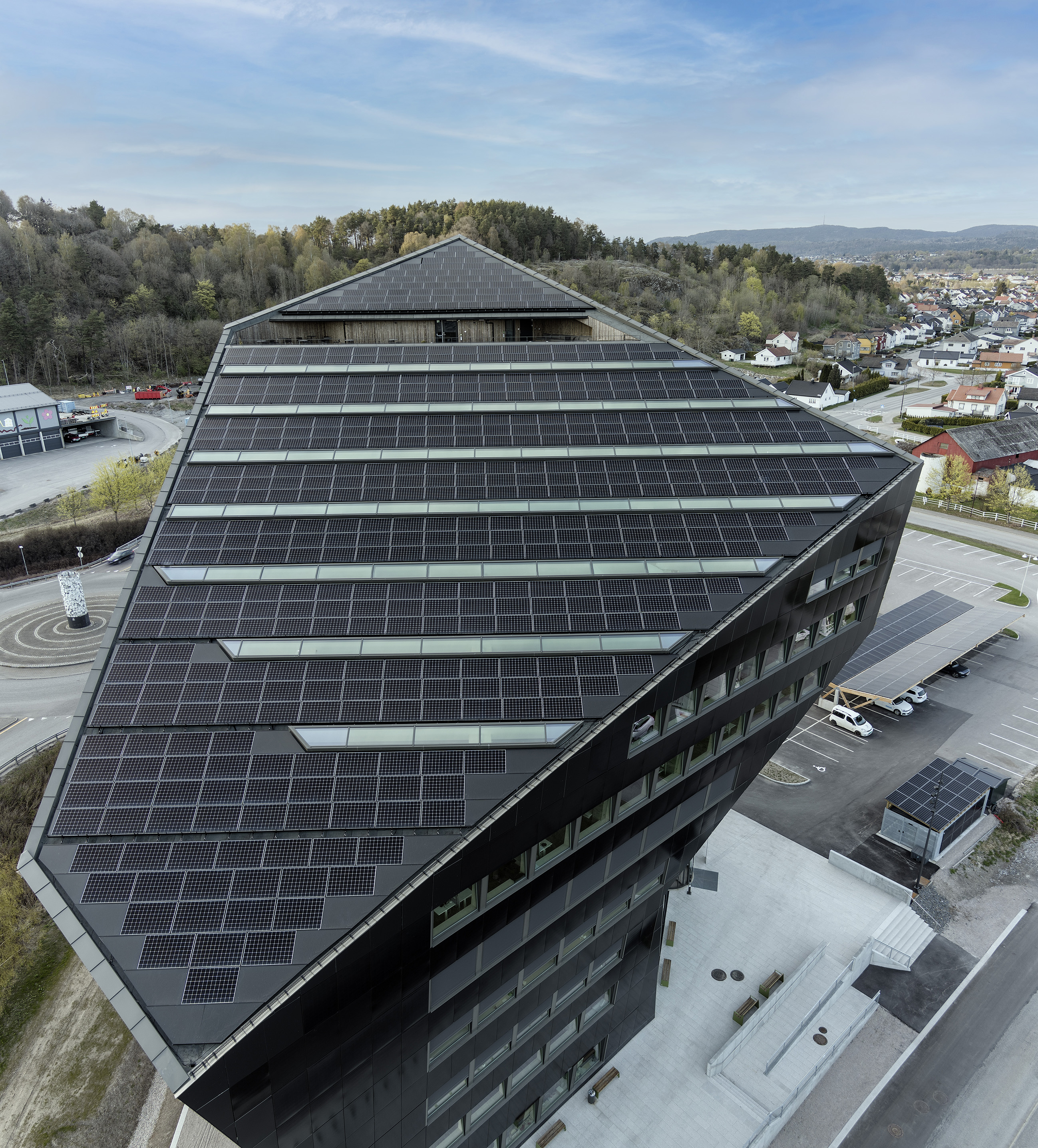 Die (i)konische Gebäudeform macht nicht nur optisch ein gute Figur. Auch unter energetischen Gesichtspunkten ist sie vorteilhaft: Um ein Maximum an Sonnenstrahlen einzufangen, wurde die Dachfläche imposant um 24 Grad gen Süden geneigt und mit hocheffizienten integrierten Photovoltaik-Modulen der dänischen Firma SolarLab mit einem Wirkungsgrad von 22 Prozent und einer Leistung von 210 Kilowatt Peak bestückt. Die schräg nach oben verlaufende, abgewinkelte Südostfassade erhielt eine ebensolche Ausstattung, genauso wie das Dach des neben dem Gebäude befindlichen Carports. Jährlich produziert die insgesamt fast 1.500 Quadratmeter große Modulfläche etwa 243.000 Kilowattstunden Sonnenstrom: Davon entfallen lediglich knapp 50.000 Kilowattstunden auf die Betriebsenergie, während rund 193.000 Kilowattstunden zum Ausgleich der Klimabilanz verbleiben, die in dem hausinternen 130-Kilowattstunden-Stromspeicher zwischengespeichert werden. Überschüssig produzierte Energie wird in die Autoladestationen und damit zurück in den Stromkreislauf geleitet. Über die Lebensdauer von 60 Jahren erzeugt das Plusenergiehaus auf diese Weise fast 15 Millionen Kilowattstunden CO2-neutralen Strom. Damit ist das „Powerhouse Telemark“, bezogen auf die Angaben in „Norwegen: Beheizung und Kühlung von Gewerbe- und Industriegebäuden mit erneuerbaren Energien“, herausgegeben von der Deutsch-Norwegischen Handelskammer in Oslo, aktuell eines der effektivsten Solarkraftwerke Norwegens.