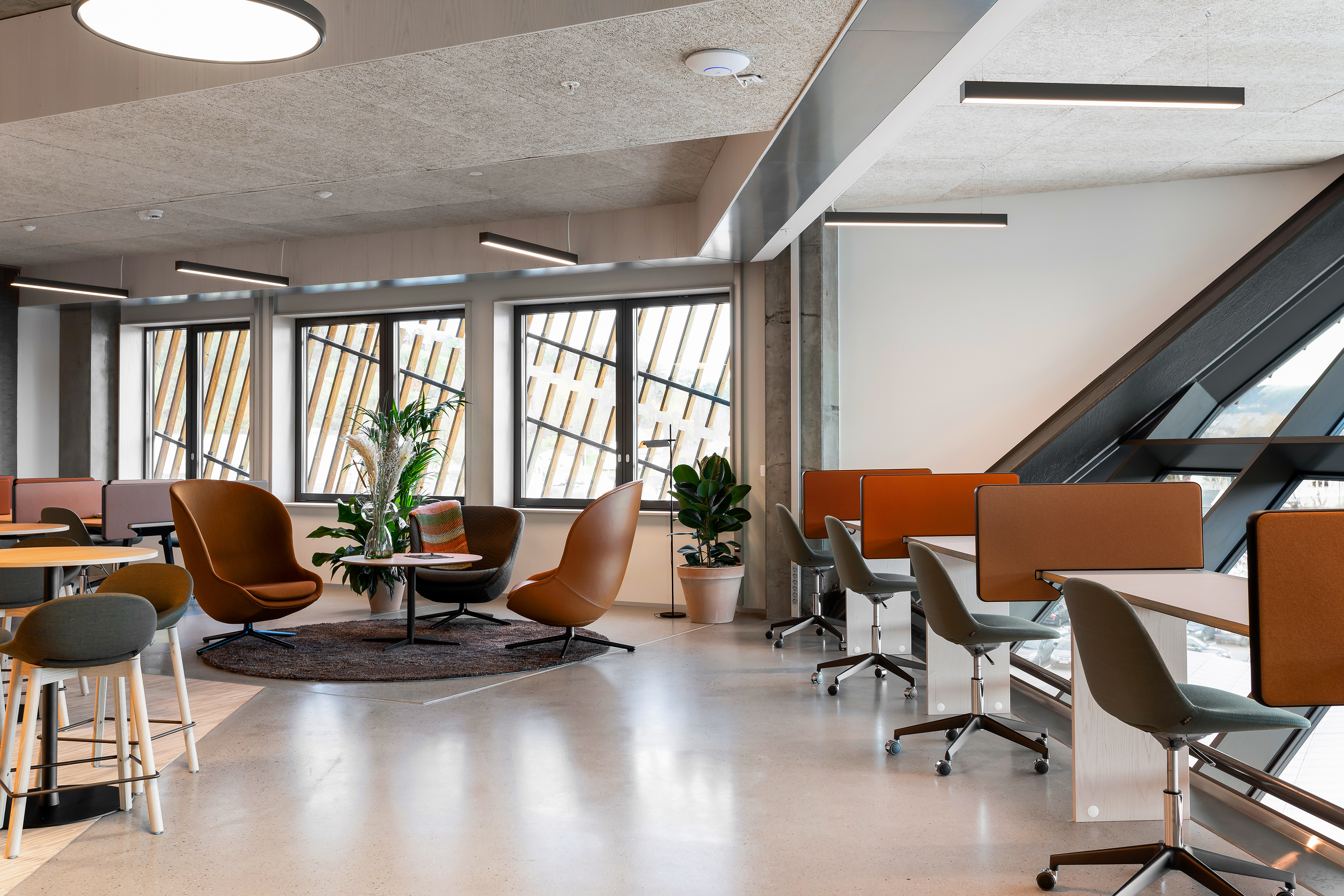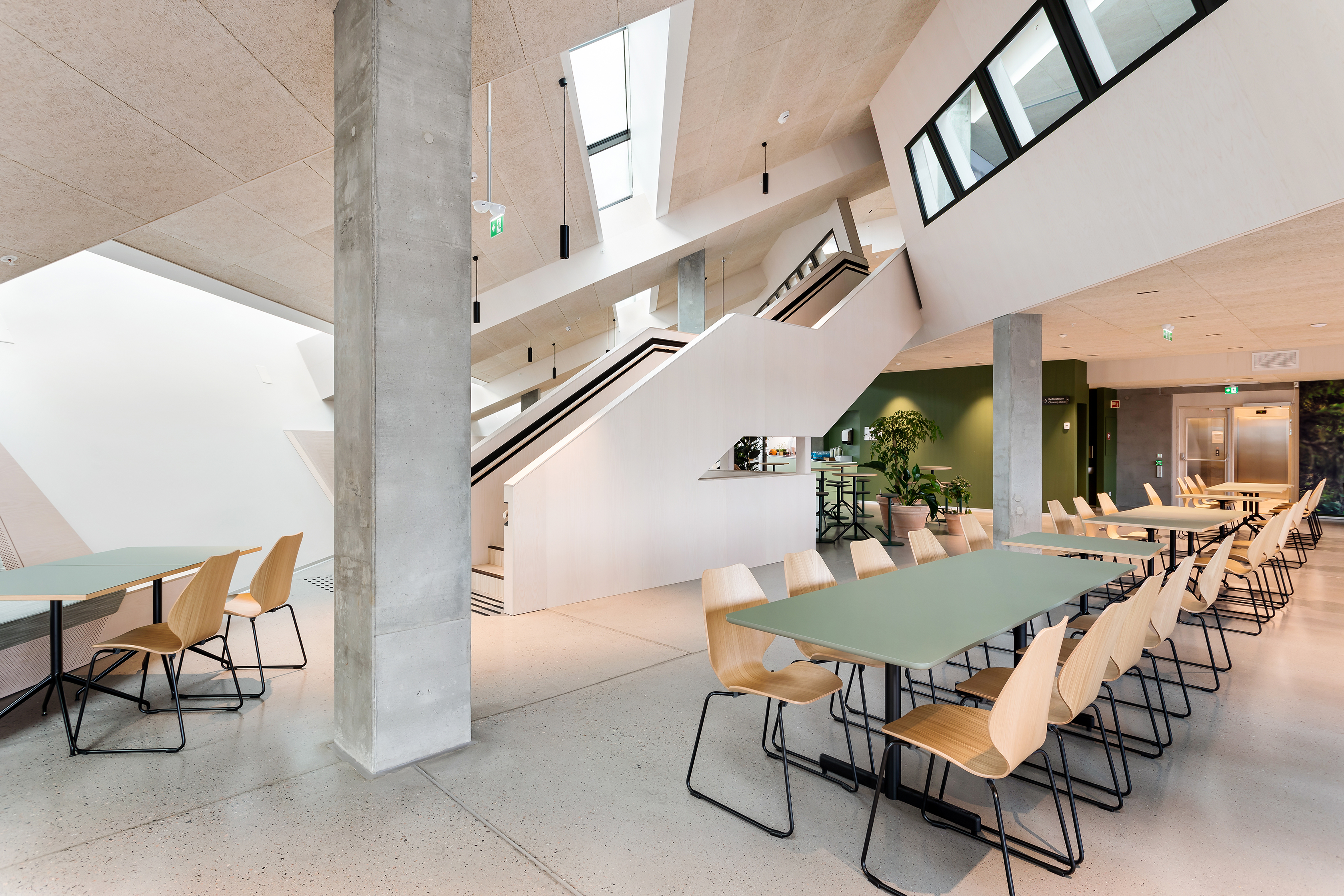 Ebenfalls mit Bedacht geschah die Innenraumkonfiguration. Vom Empfangsbereich im Erdgeschoss bis zur gemeinsamen Personalkantine und den Penthouse-Tagungsräumen führen zwei großzügig gestaltete, offene Treppen in die obersten Etagen. Das lädt nicht nur dazu ein, den Weg zu Fuß zurückzulegen und etwas für den Kreislauf zu tun, sondern fördert darüber hinaus die zufällige Begegnung und damit die Kommunikation der Nutzerinnen und Nutzer untereinander. Im neunten Stock verbindet eine markante Holztreppe die Kantine mit den Tagungsräumen und führt hinaus auf die Dachterrasse, von wo aus sich ein herrlicher Blick auf den Fjord bietet. Standardisierte Innenraumlösungen und Co-Working-Spaces bieten den Mietern die Möglichkeit, ihre Büroräume nach Bedarf zu skalieren, um flexibel zu sein und Remote-Working-Konzepte umzusetzen. Über die Smartphone-App der Softwarelösung Orbit lassen sich diverse Anwendungen personalisiert steuern, etwa der Check-in, die Raumbuchung oder die Anmeldung von Besuchern.