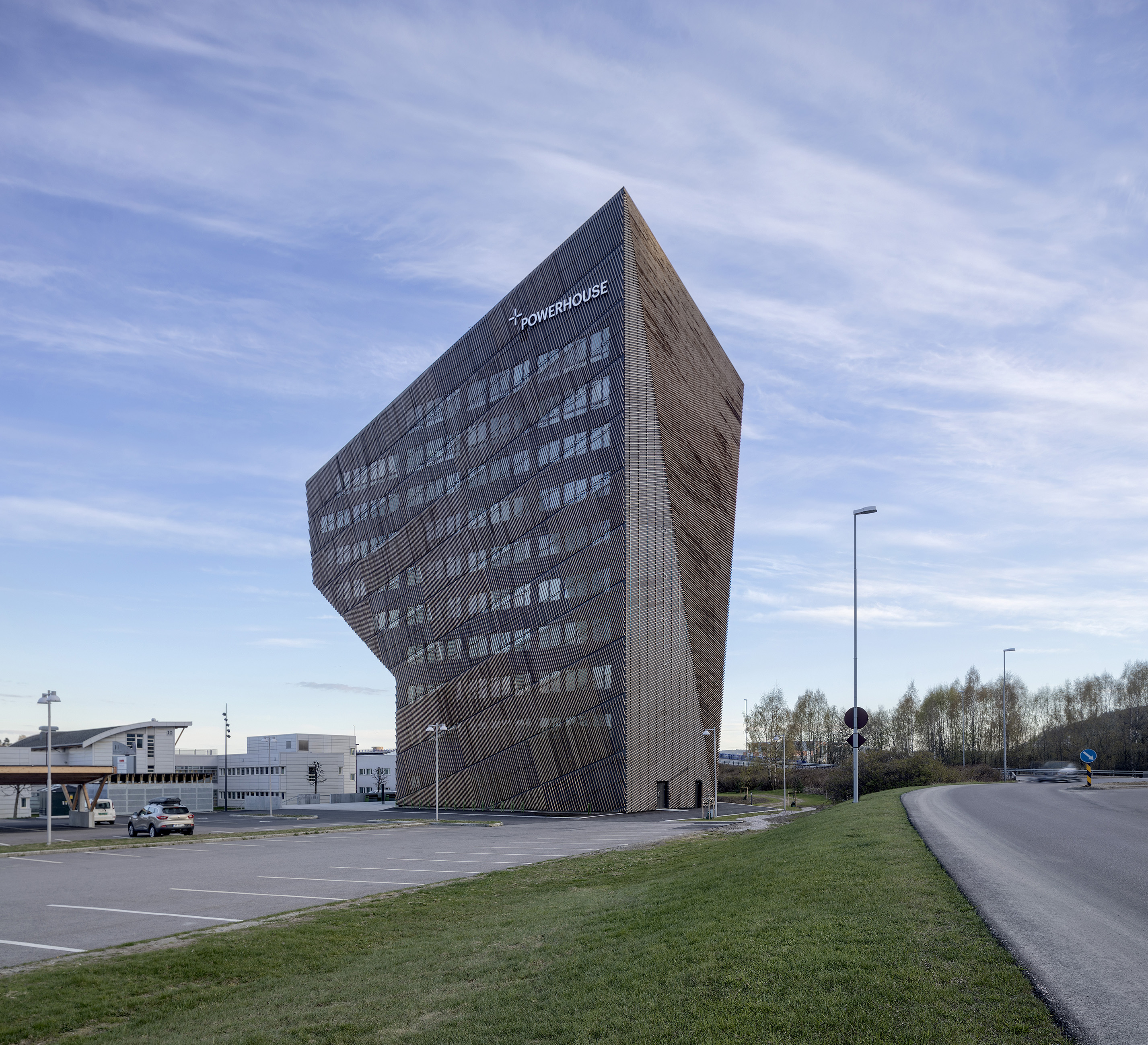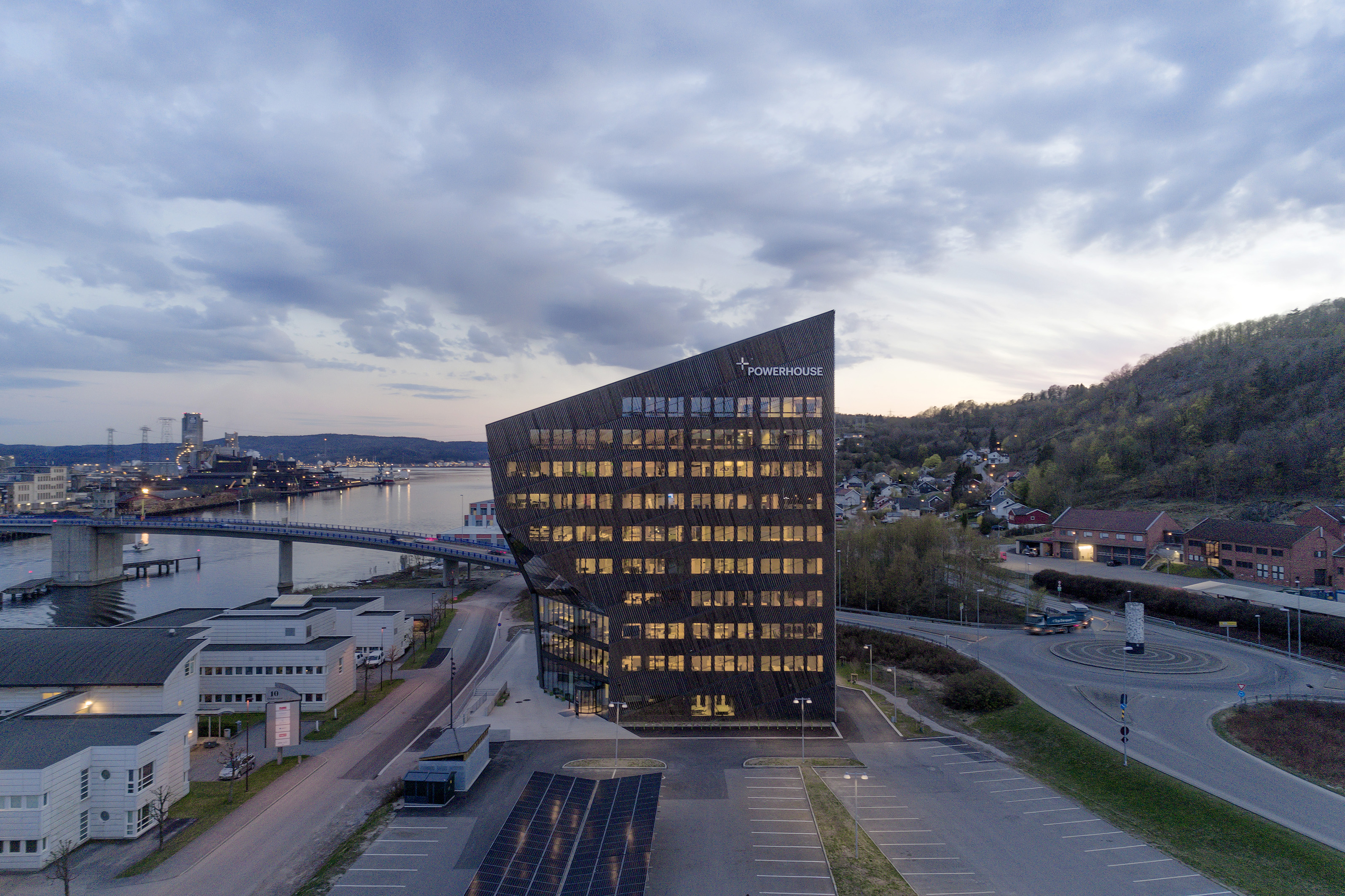 Weit über den Horizont der Industriestadt Porsgrunn hinaus ist die markante Silhouette des „Powerhouse Telemark“ sichtbar. Bei Sonnenschein funkelt der elfstöckige Büroturm wie ein bernsteinfarbener Diamant in XXL-Größe, von dessen Dachterrasse sich ein fulminanter Blick auf das etwa 35.000 Einwohner:innen zählende Oberzentrum der Provinz Telemark und den Frierfjord bietet. Fertiggestellt im Sommer 2020, ist das Nullemissionsgebäude zum Symbol für die Wende zu einer Green Economy in der Region geworden, die etwa 150 Kilometer südlich von Oslo liegt und eine lange Historie als fortschrittlicher Wirtschaftsstandort hat. Mit der UNESCO-Weltkulturerbestätte Vemork, die in derselben Provinz wie Porsgrunn liegt, ist hier eines der größten Wasserkraftwerke des frühen 20. Jahrhunderts verortet. Passender kann der Ort für ein „Powerhouse“ demnach nicht sein.