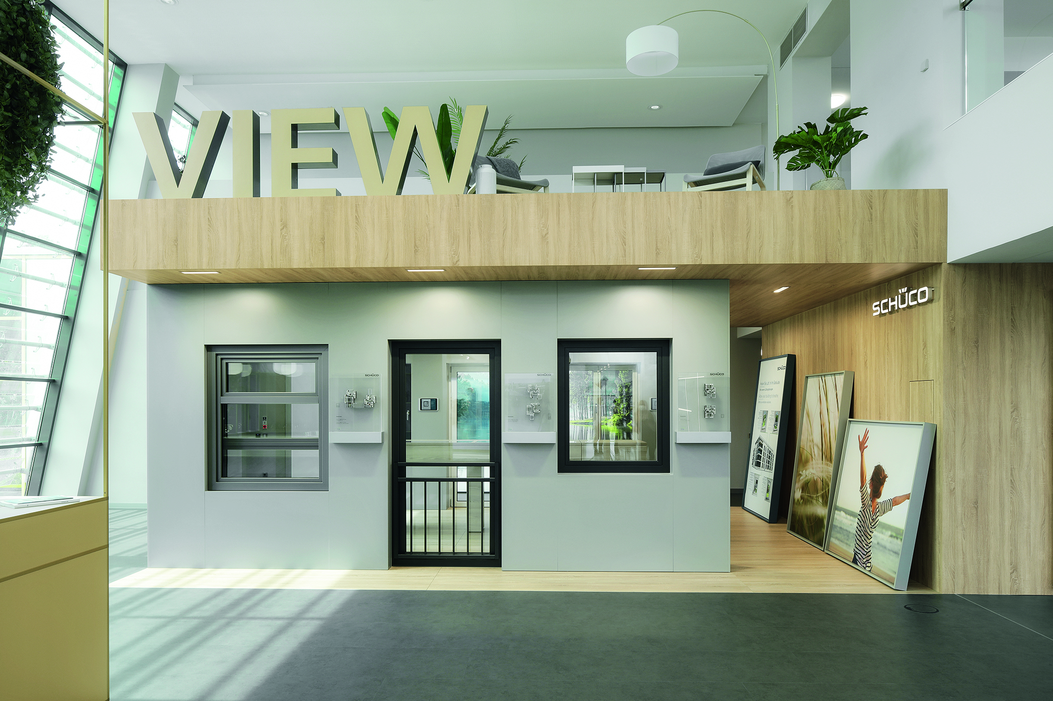 The overall architectural concept of the showroom is characterised by a combination of anthracite grey surfaces, warm gold and woodgrain shades, a range of stone looks and a variety of plants. Visitors to Schüco are welcomed to an inviting foyer where a social wall provides information about current topics at Schüco. Designed as a room-in-room construction, the exhibition area with the topic studios opens out directly onto a mixed-use events space. The different areas are clearly demarcated with large lettering. The Arrival, View and Panorama topic studios showcase Schüco residential solutions, while the Service area presents the comprehensive Schüco service portfolio.