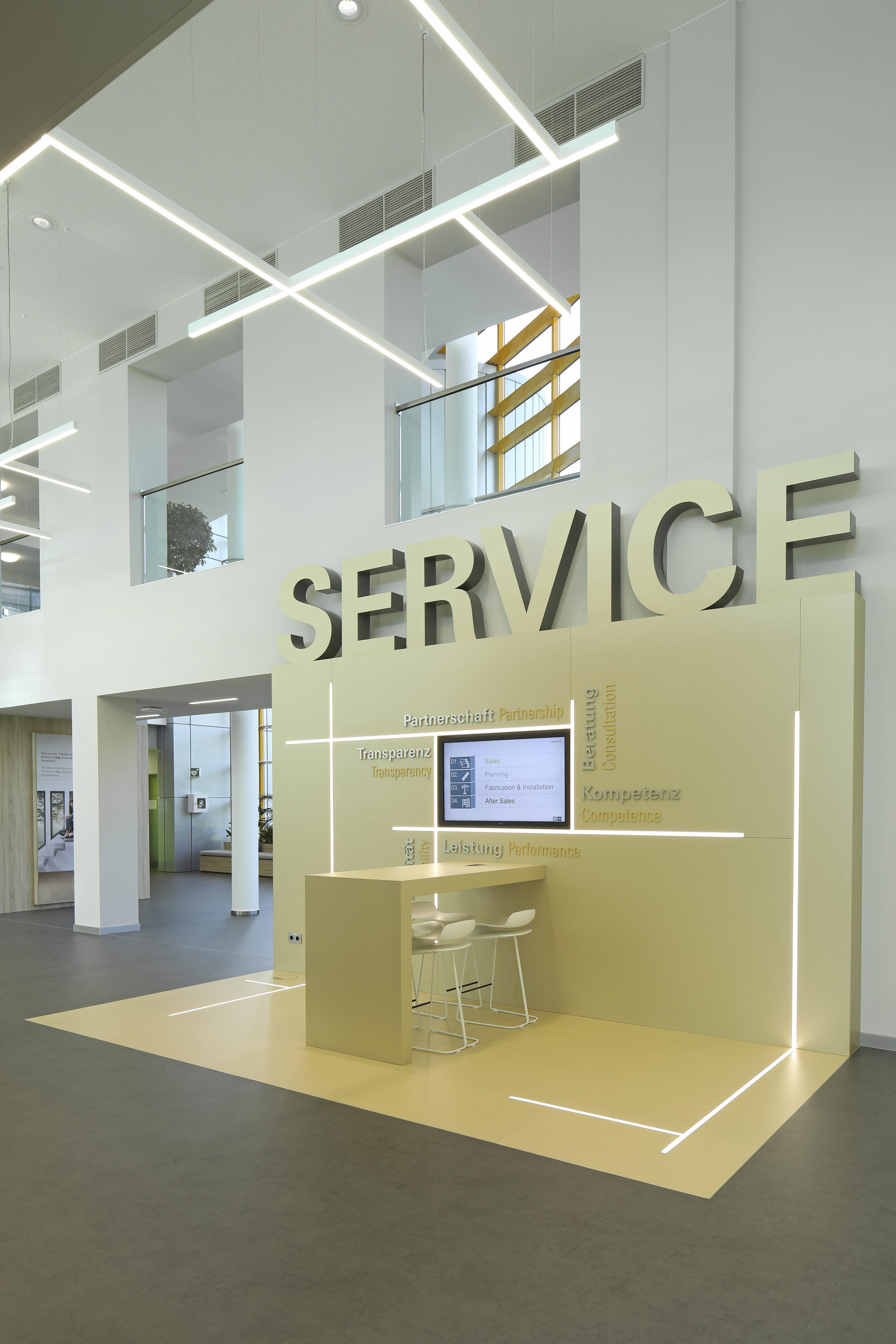 The Service area presents the comprehensive range of services provided by Schüco Polymer Technologies KG. Here there is a particular focus on digital solutions. These include Schüco PolyCal, a new window design software co-developed with Orgadata, which is used to calculate and fabricate Schüco PVC-U windows, doors and sliding doors easily and efficiently. The Schüco PolyPlan planning and specification software is also new and offers comprehensive technical support for the construction of all kinds of unit types and accessories, and provides help when specifying and creating quotations. In addition, visitors to the showroom can gain an overview of the services on offer and the tools available for sales, planning, fabrication and installation as well as after sales.