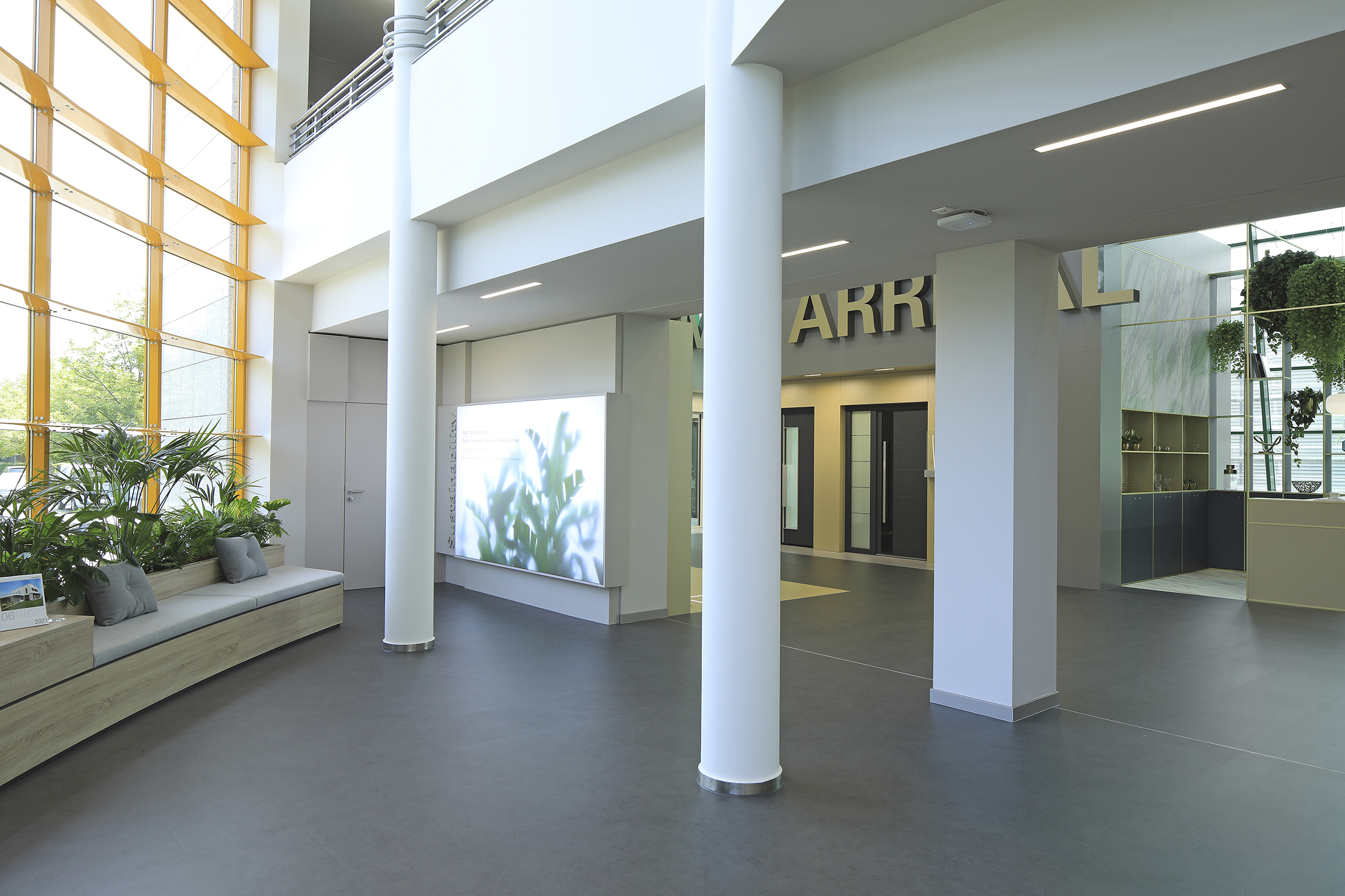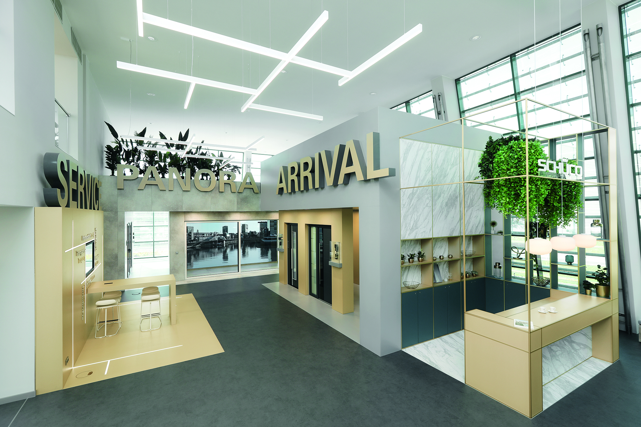 Ein Mix aus anthrazitfarbenen Flächen, warmen Gold- und Holztönen, verschiedenen Steinoptiken und Pflanzen prägt das architektonische Gesamtbild des Showrooms. Empfangen werden die Schüco Gäste in einem einladenden Foyer mit Social-Wall, die über aktuelle Themen von Schüco informiert. Der Ausstellungsbereich mit den Themenstudios, als Raum-in-Raum-Konstruktionen gestaltet, und eine variable Eventfläche schließen sich mit einem offenen Übergang direkt an. Mit großformatigen Schriftzügen werden die verschiedenen Bereiche markant gekennzeichnet. In den Themenstudios Arrival, View und Panorama werden Schüco Wohnbaulösungen präsentiert und im Service-Bereich das umfangreiche Schüco Dienstleistungsportfolio.