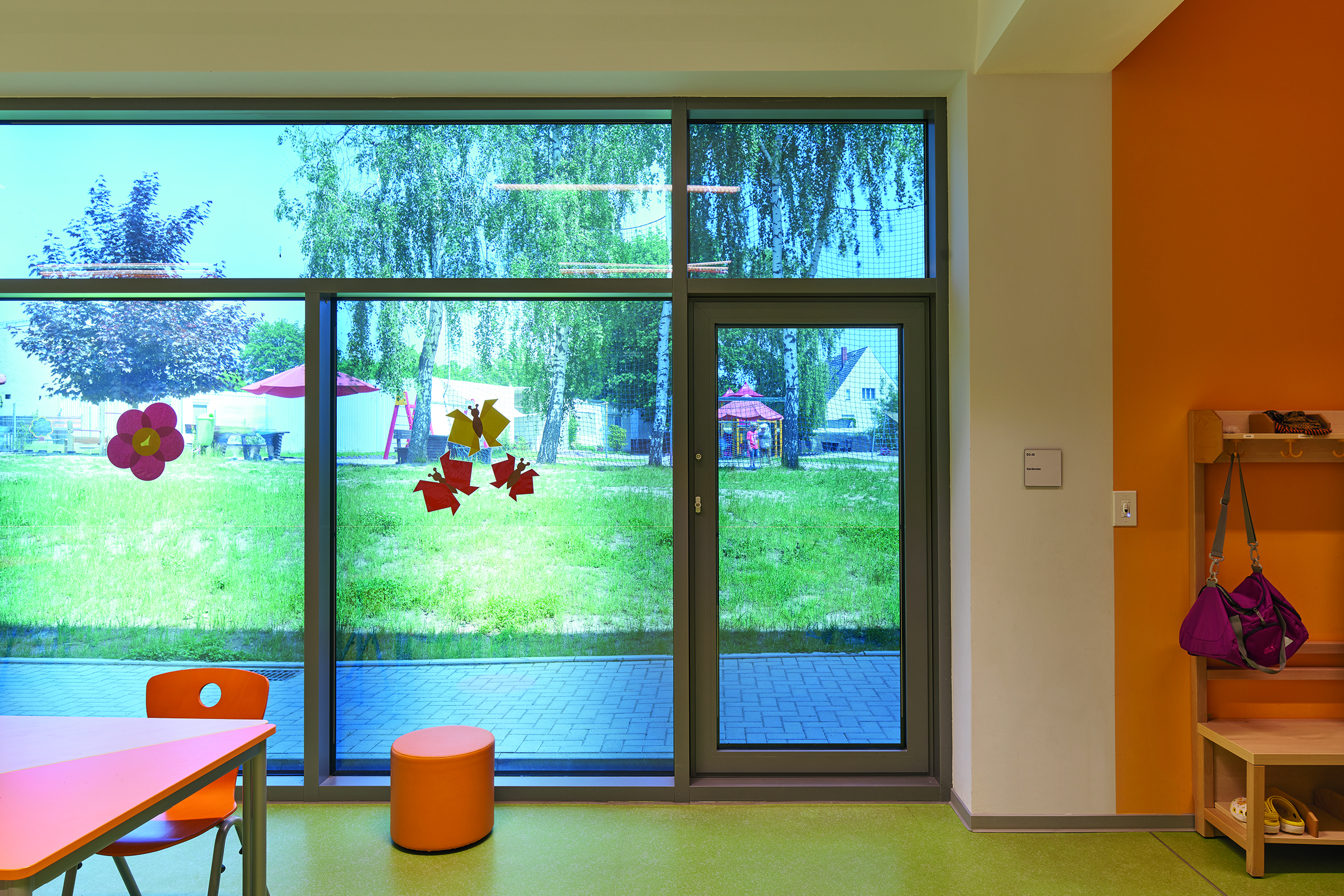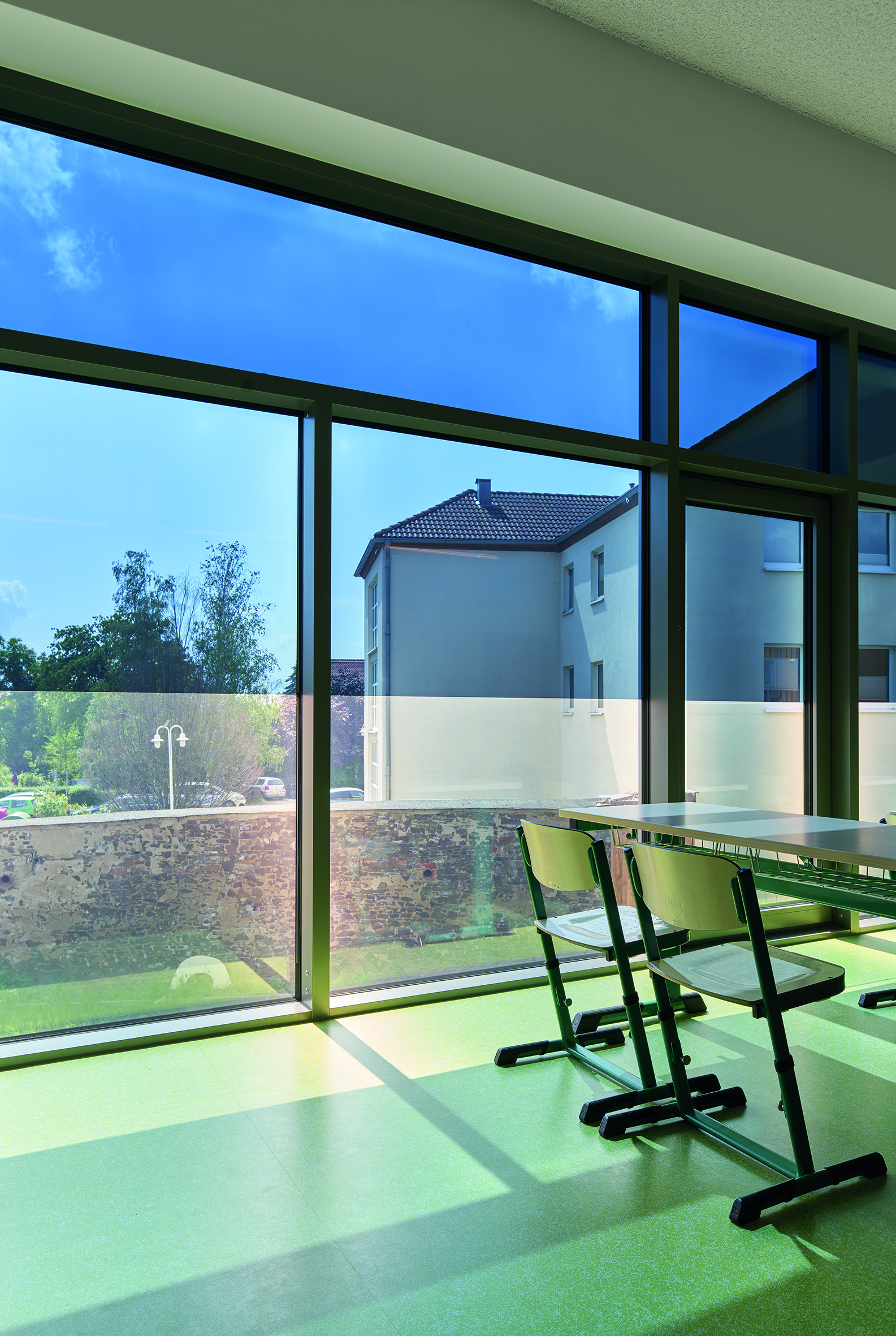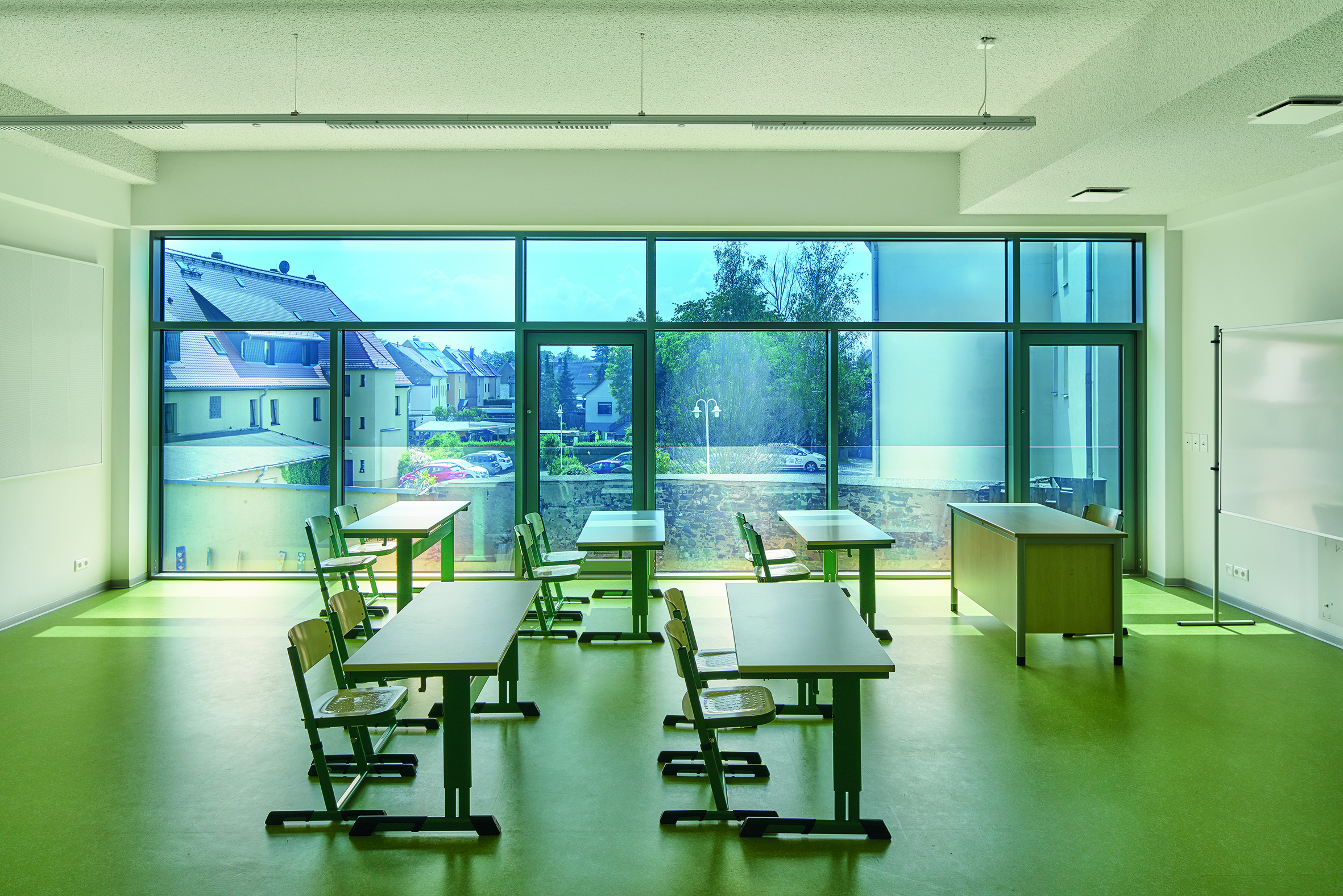 A key part of the energy concept is the building's thermal insulation. To this end, the electrochromic, zoned SageGlass®, manufactured by Saint-Gobain, was fitted in highly thermally insulated Schüco aluminium façade, window and door systems (FWS 60.HI, AWS 90.SI+ and ADS 90.SI) and used in all of the building envelope's transparent areas. The glass can be switched electronically and automatically regulates the amount of daylight let into the building, protecting pupils and teachers against glare with its colour tinting. The sun shading works even in severe weather conditions, and you can still see outside without restriction, despite the shading. "We chose SageGlass® because it provides convenient sun shading and a pleasant indoor climate," explains project architect Sabine Schlicke. Her colleague Martin Fink adds, "Another benefit is the zoning of the panes. With this you can bring light into the room while protecting against glare."