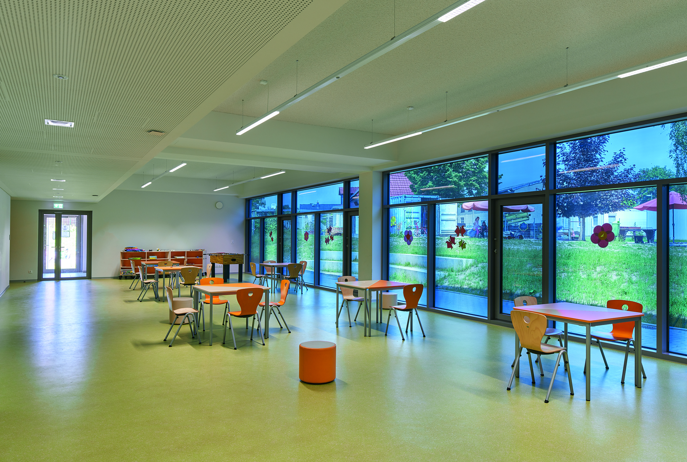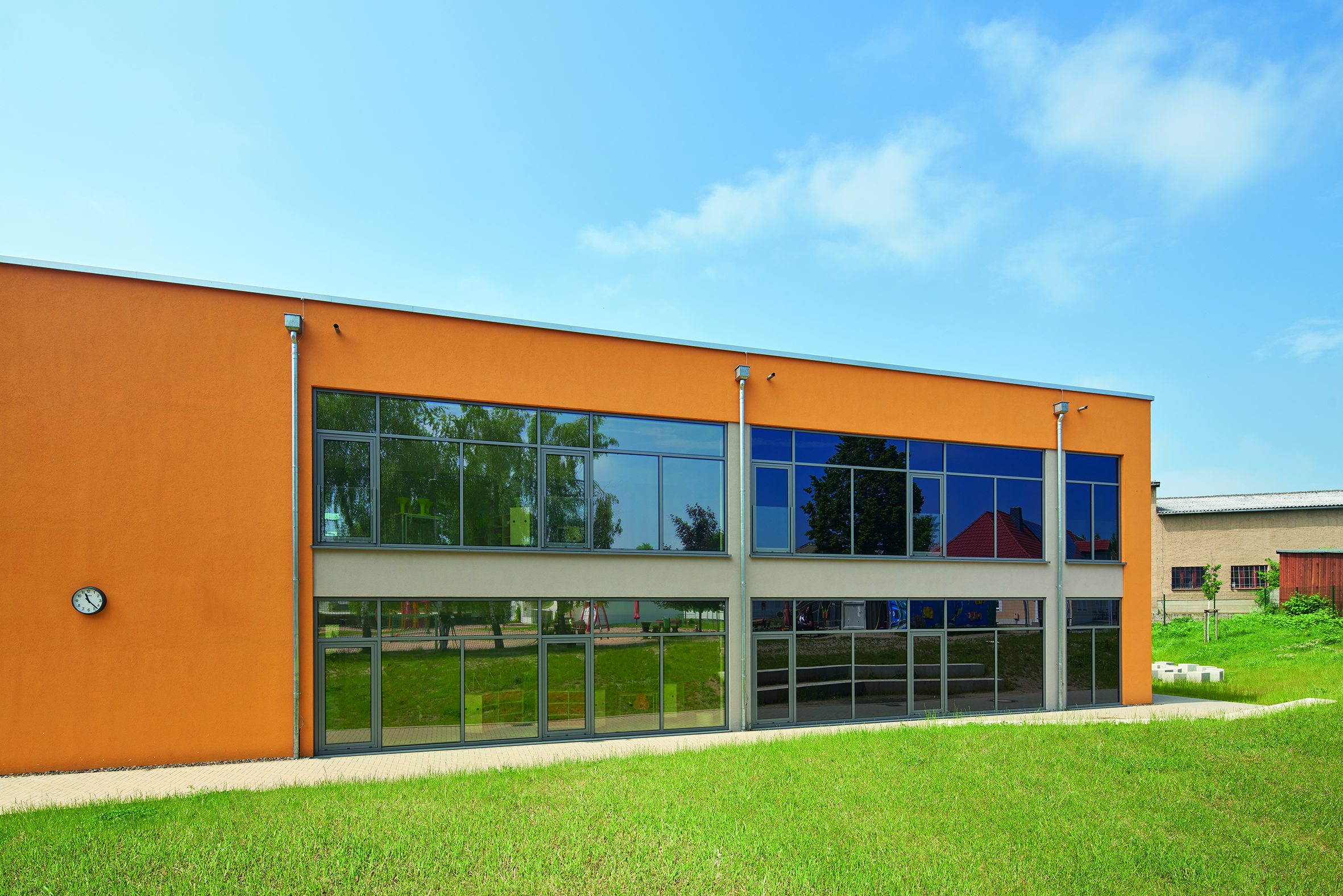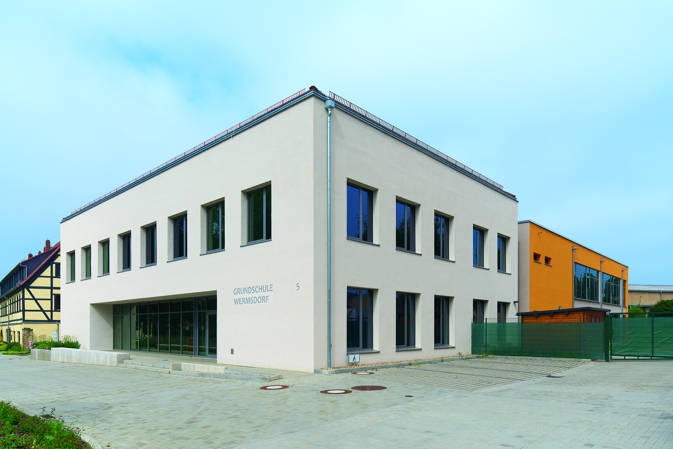Until very recently, pupils at Wermsdorf primary school still received their lessons in the former post office of the municipality, which has a population of 5000 people. They've now moved into the new school building next to the old one in the heart of the town. Designed as a zero-energy building, the newbuild uses state-of-the-art technology. Concrete core activation in the floors/ceilings heats and cools the building. A central ventilation system in combination with a heat pump and heat exchanger ensures that the rooms have a constant supply of fresh air at the right temperature. The roof has a photovoltaic system, which transfers any excess energy it produces in the summer months over to neighbouring buildings. Smart regulation technology synchronises all the components of the building management system.