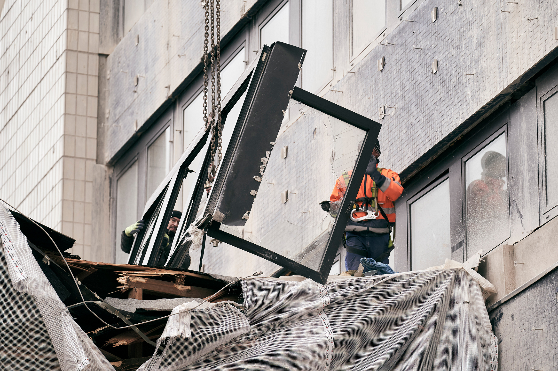 Als man sich entschieden hatte, die Fassade zu erneuern, stand für Schüco sofort fest, das Thema Recycling aufzugreifen. Denn die Bestandsfassade aus den 1980er- und 2000er-Jahren hatte einen hohen Aluminiumanteil. Zudem ist das Bielefelder Unternehmen Gründungsmitglied der A|U|F, einem Verein, der einen geschlossenen Wertstoffkreislauf für Aluminium in der Fenster-, Türen- und Fassadenbranche organisiert. Folglich wurden alle Aluminiumbauteile der Fassade und des Vordachs rückgebaut und dem A|U|F-Rohstoffkreislauf zugeführt. Um eine sortenreine Trennung zu gewährleisten, sammelte das mit dem Abriss beauftragte Unternehmen die einzelnen Materialfraktionen so weit wie