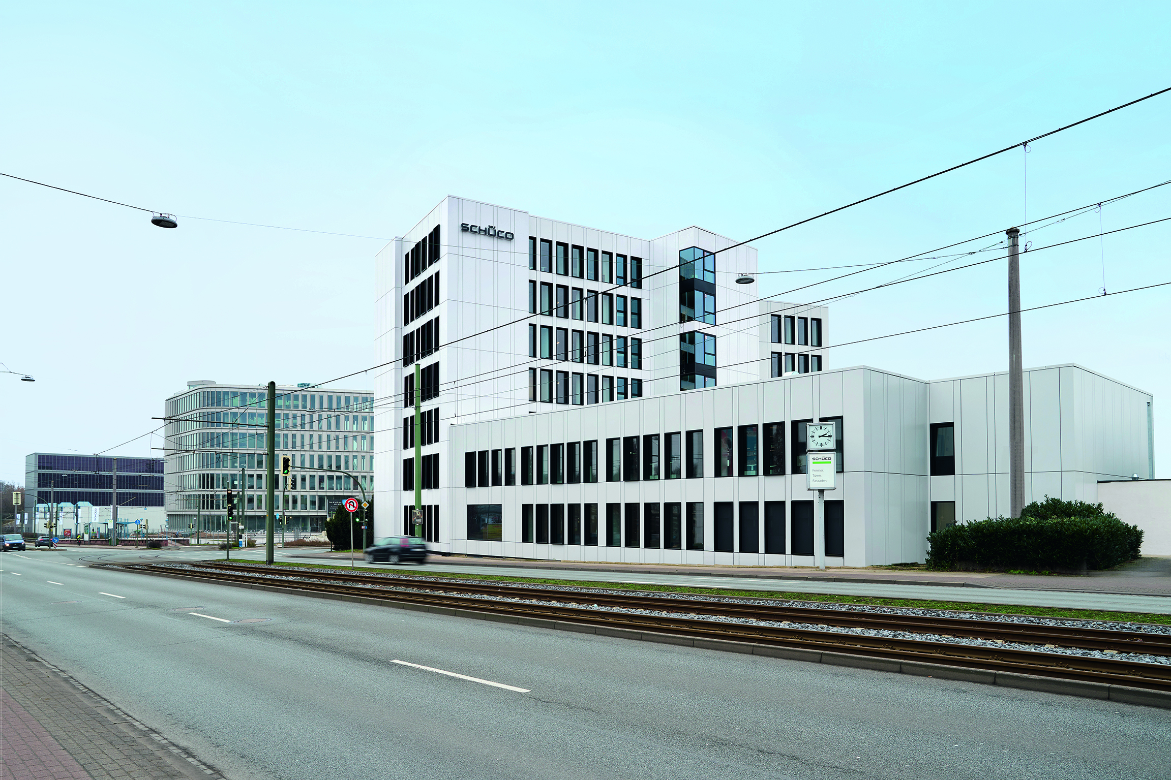 Die Modernisierung des ehemaligen Verwaltungsgebäudes auf dem Schüco Campus nimmt in mehrerlei Hinsicht eine wichtige Rolle in der Geschichte des Bielefelder Unternehmens ein. Zum einen bildet der 5.800 m2 große Gebäudekomplex gemeinsam mit dem gegenüberliegenden Schüco One Neubau ein identitätsstiftendes Gebäudeensemble. Zum anderen bot das Projekt die Chance, an und in einem Bestandsbau Konzepte zu realisieren und Produkte zu präsentieren, die dem Nachhaltigkeitsgedanken verpflichtet sind.