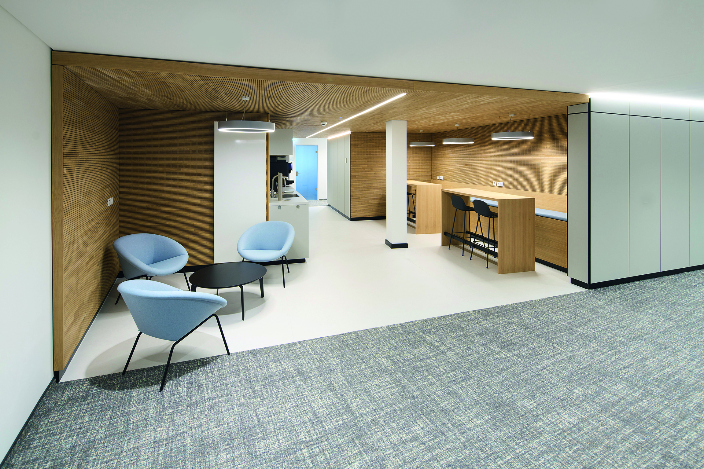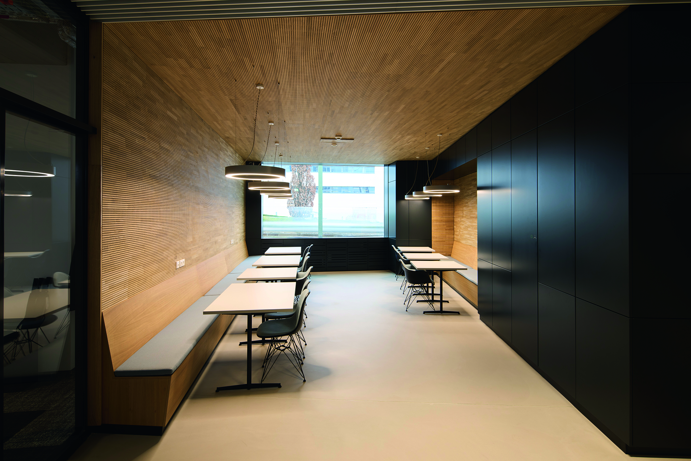 Ein neues Gesicht erhielten auch die Empfangs- und Erschließungsflächen sowie die vertikale Erschließung. Zu diesem Zweck entfernte man den bestehenden Aufzugsschacht in der Mitte des Gebäudes. Ein neuer Aufzug befindet sich nun am Schnittpunkt aller drei Baukörper an der rückwärtigen Hoffassade. Die hinzugewonnene Nutzfläche funktionierte das Planungsteam in offene Kommunikationszonen um. Darüber hinaus ist die Überarbeitung des Außenbereichs für das Jahr 2022 geplant. Um den Mitarbeitenden auch dort eine höhere Aufenthaltsqualität bieten zu können, werden die umliegenden Flächen entsiegelt und begrünt.